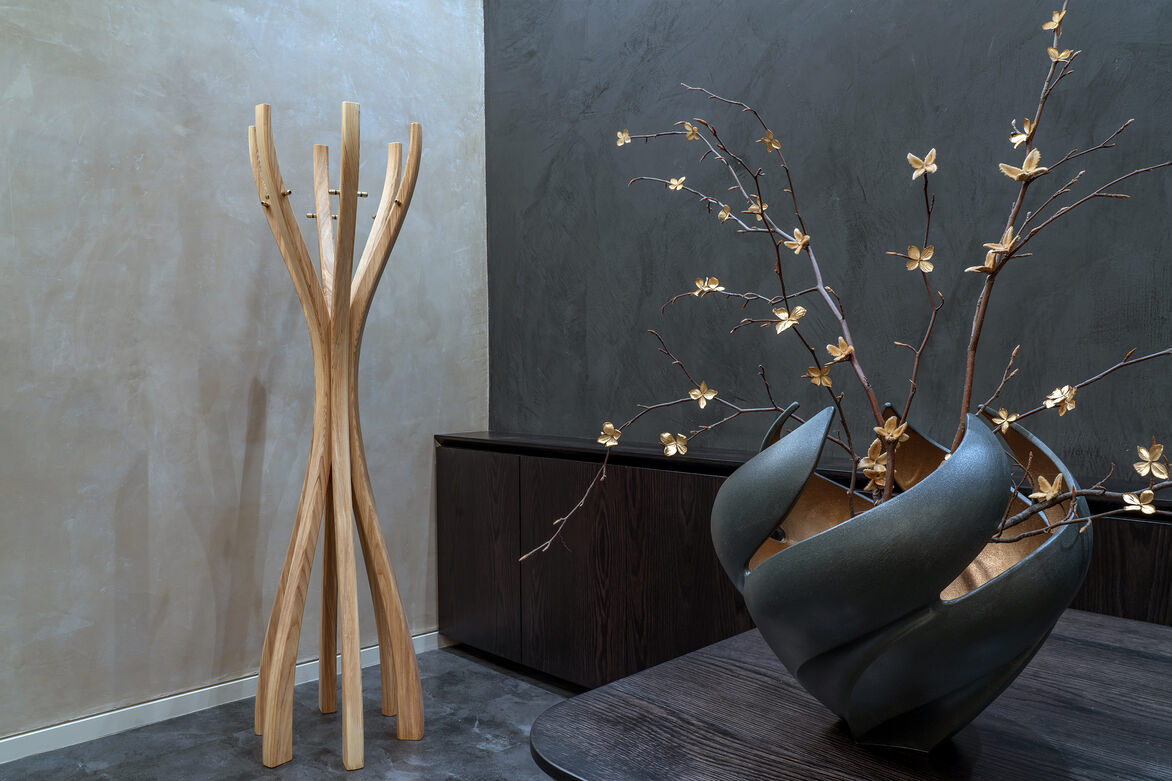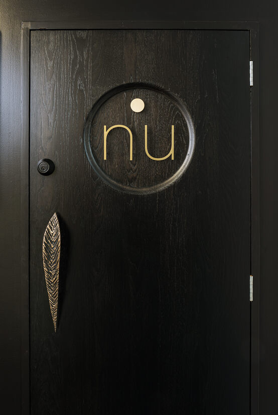 The front door welcomes you with an ebony-stained solid wood door showcasing the brass yin yang aesthetics of the studio branding, accompanied by a roughly cast Nikau leaf door handle, referencing nature and its grounding properties. The handle’s polished high point’s link to the brass materiality of the branding.