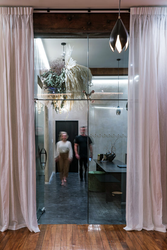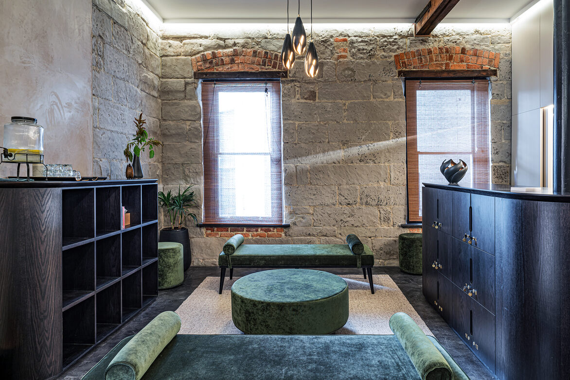 Light-reflecting plastered walls entice you towards an oversized reception table that mirrors the appearance of the front door and the custom cabinetry throughout the lounge and changing rooms. The artisanally crafted objects that catch your attention throughout the studio are clad in rich matte black and copper lustre glazes to cast a contrast with the original heritage stone and red bricks.