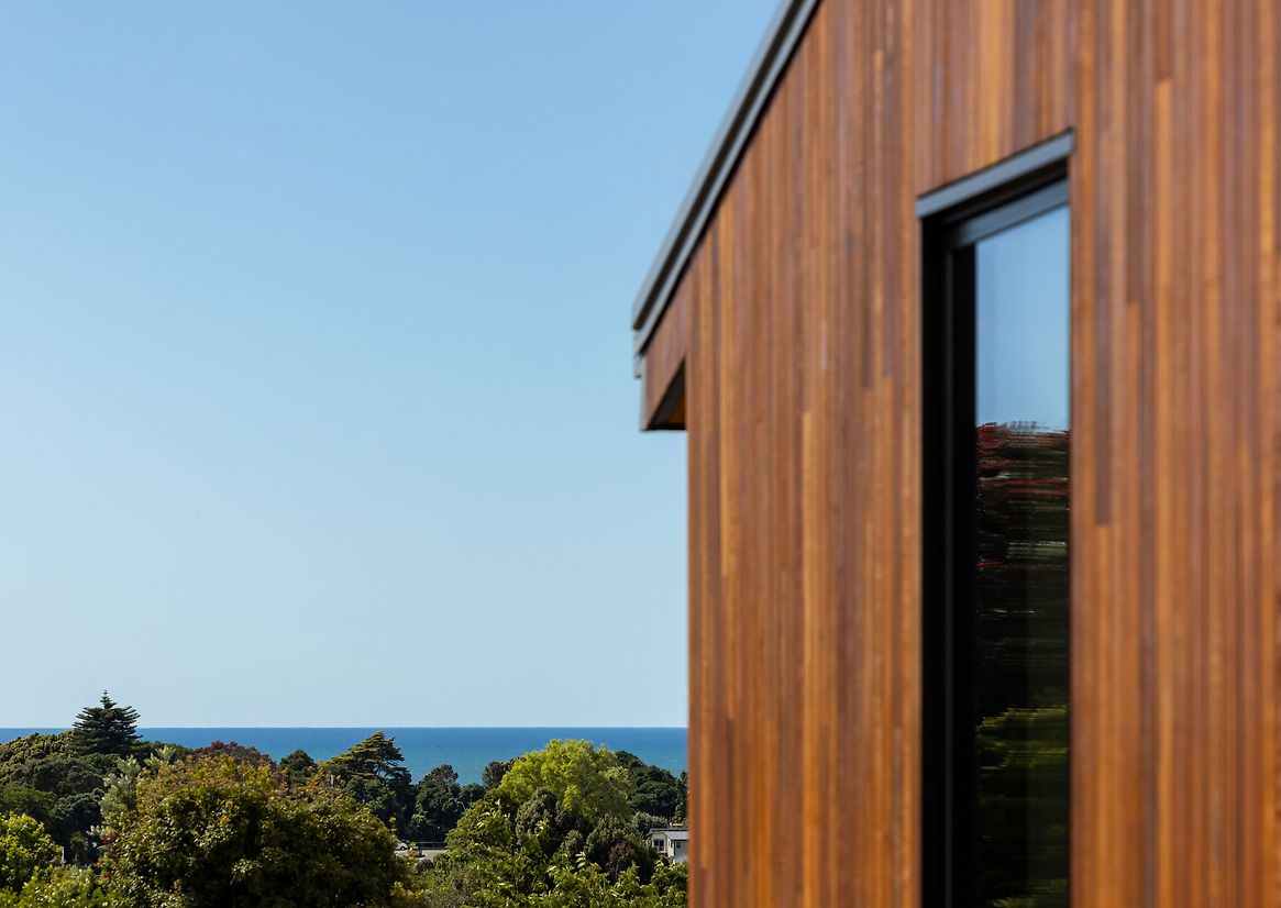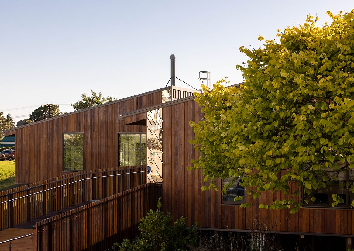 The design is a north facing, PLT bridge structure spanning a natural valley between the hospital and a residential street. Clad primarily in recycled hardwood, it sits sympathetically amongst native planting between Mount Taranaki and the Tasman Sea. The rich, character-filled timber offers an attractive aesthetic, whilst solar panels and raw pole foundations speak to the design’s ground-breaking ambitions.