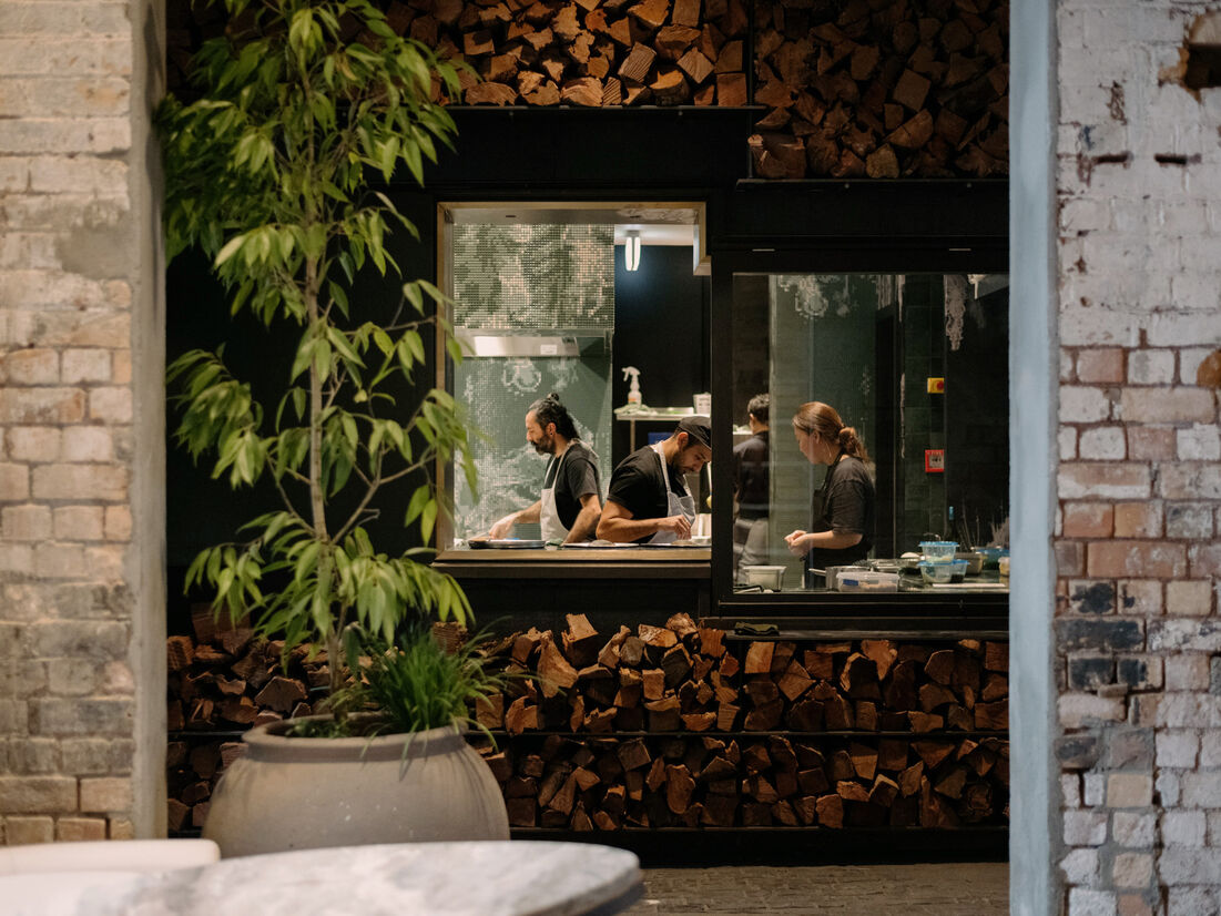 There is activity at every turn. Opposite you, a deep green mosaic-lined box acts as the backdrop to a theatre of chefs preparing exquisite dishes, the outside lined with firewood at the ready. Two fireplaces anchor the courtyard, one adding flavour to seasonal dishes, the other warmth for the patrons that surround it. Large groups or solitary guests are seated alongside marbled tables, fresh scented florals, and a tree lined laneway. You are at the heart of Tuawhiti lane, a spectator watching fine artisans and creators in action.
