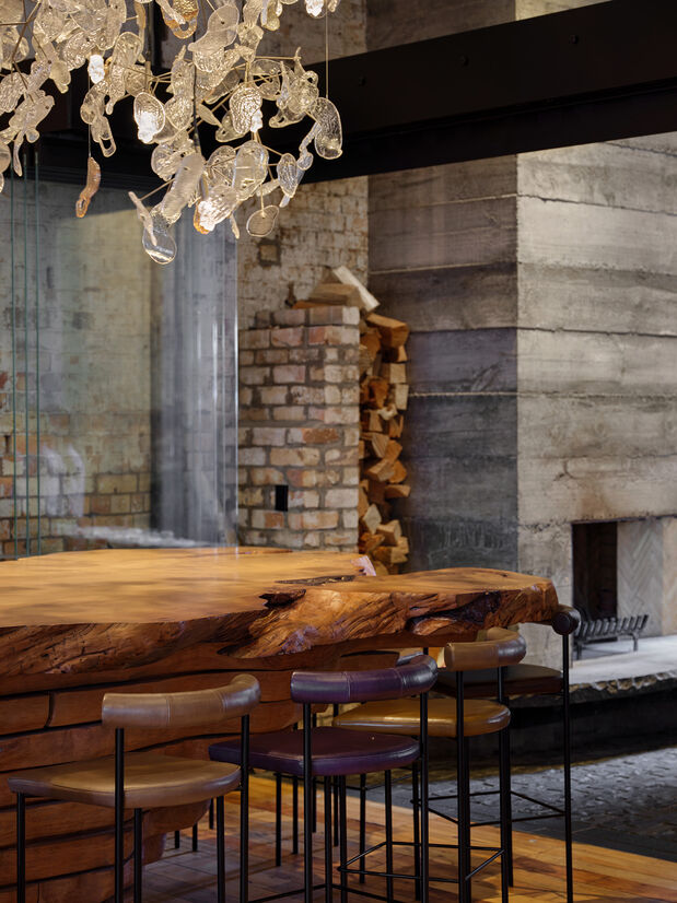 Passing from The Hotel Britomart’s lobby to the restaurant entrance, you are greeted by a twenty-thousand-year-old Kauri trunk under a cloud of glass petals – a bar and a chandelier. To the left, the ancient tree ushers one towards an open wood fire, the building shell opens itself to the laneway, leaving itself partially outside whilst still retaining its interior-like qualities.