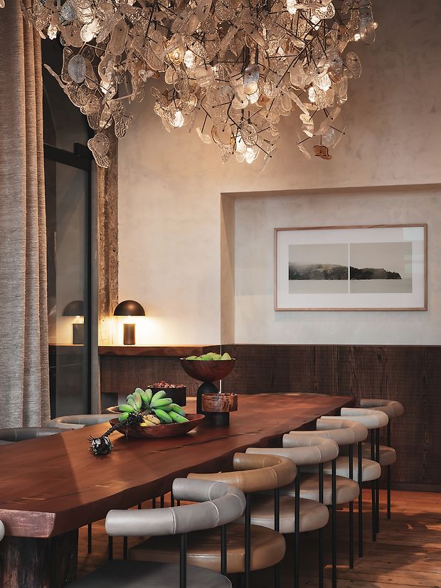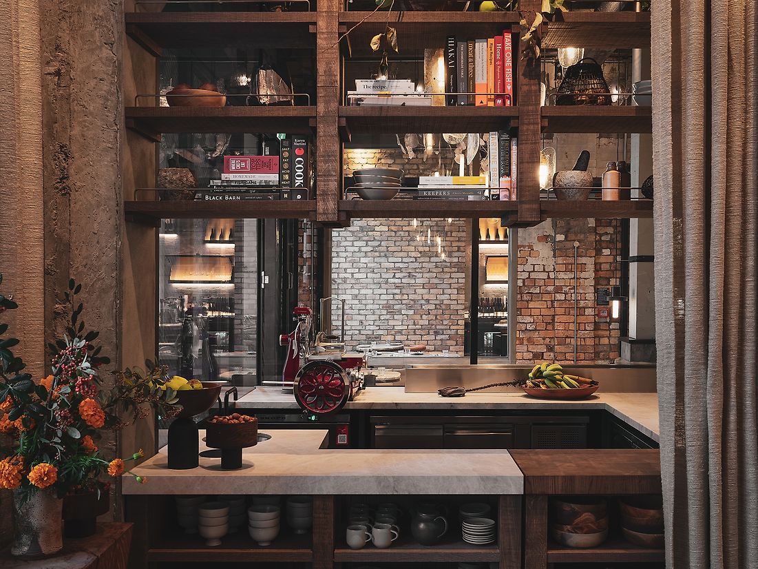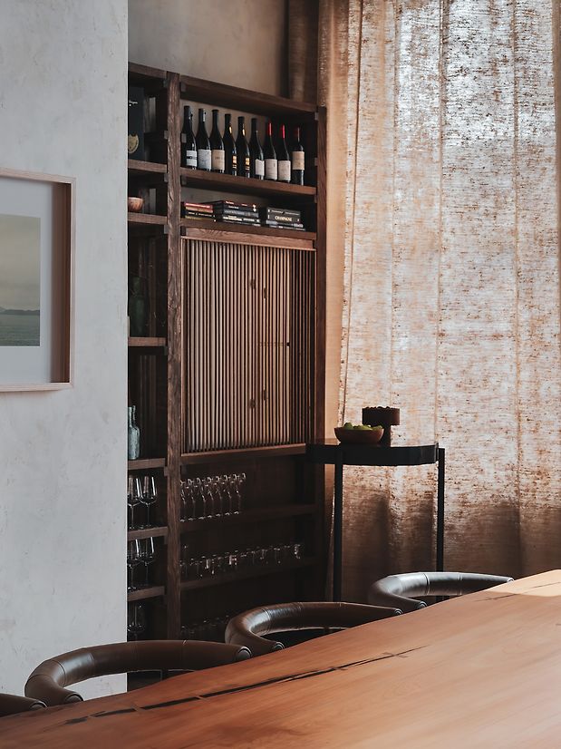 That was our goal: to unify these spaces that otherwise only loosely related; to introduce craft, detail, and an organic softness to a tough realm of cobblestones, brick, and old beams and to reconcile the old elegance with the warmth of local materials, roughened plaster walls, heavy textured curtains, bespoke furniture, that lay amidst the bespoke hand-blown chandeliers, which add a layering of dappled illumination. A single 4m long piece of swamp kauri sits untouched below, as an anchor to the space and placed carefully on a pair of old, reclaimed tree trunks to form its table. Framed by an old brick arch filled with timber display shelving, a glazed box presents a stage for Kingi's chef to perform for the adjacent laneway, whilst acting as the exclusive host to the private spaces distinguish guests.