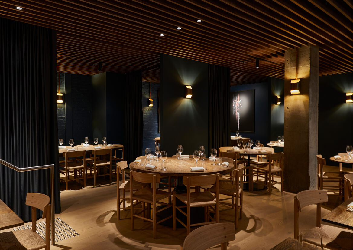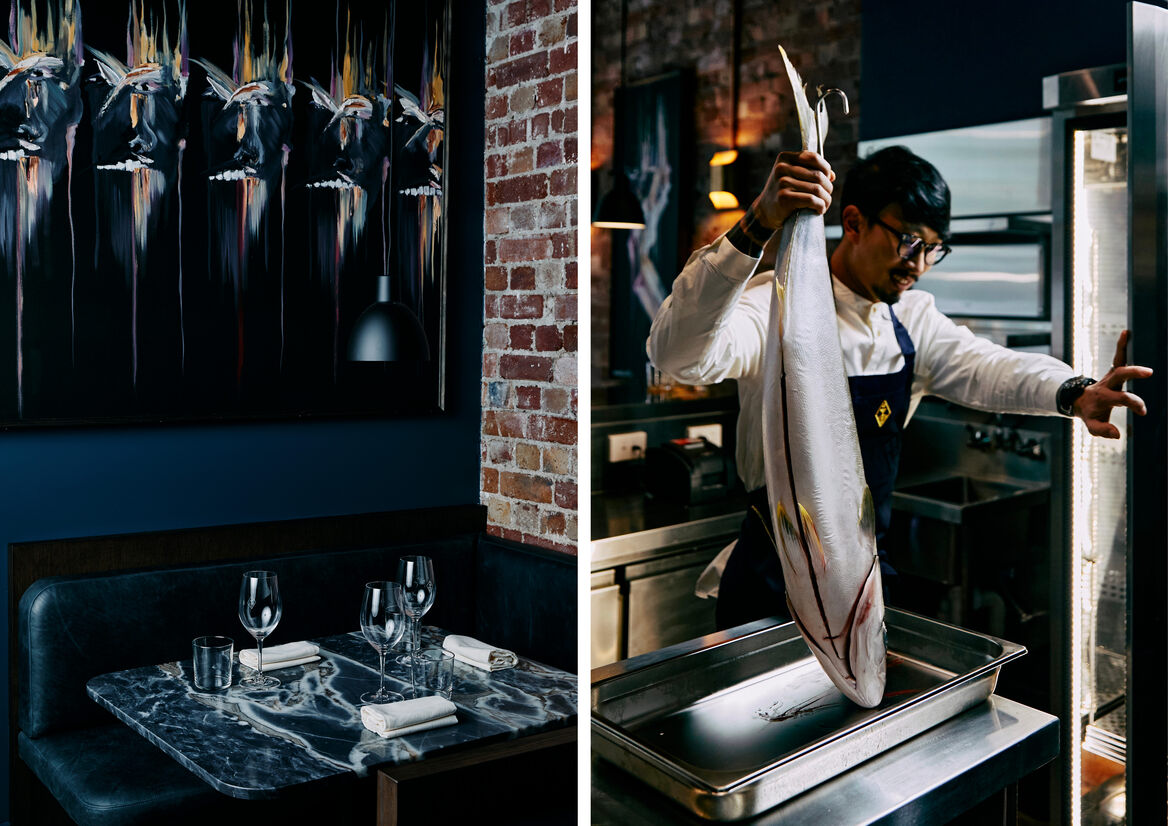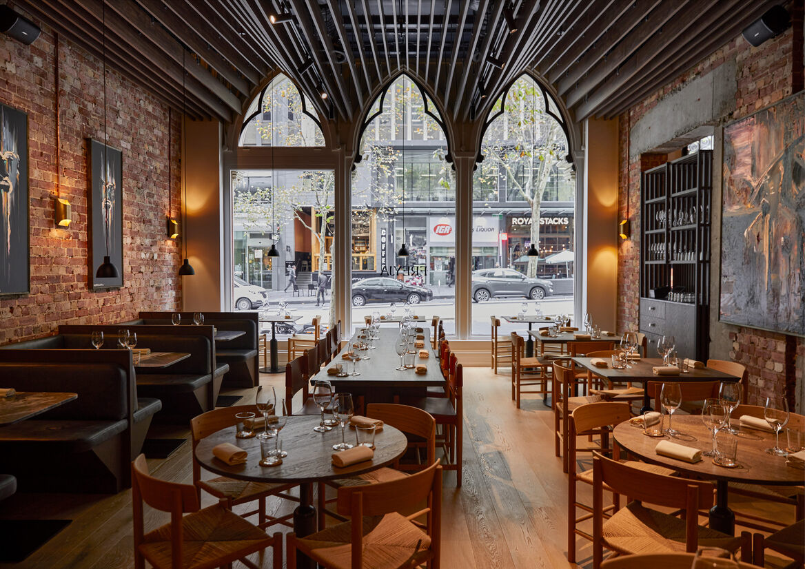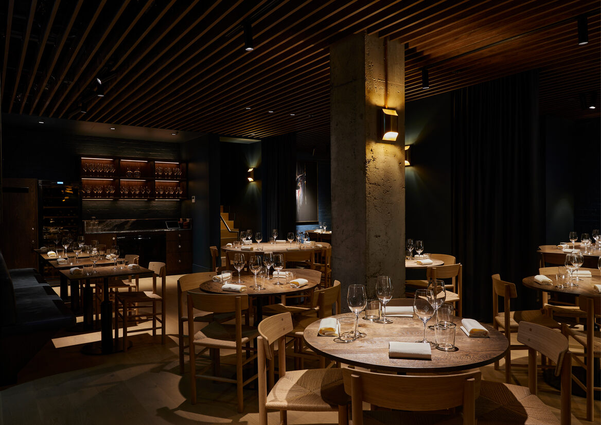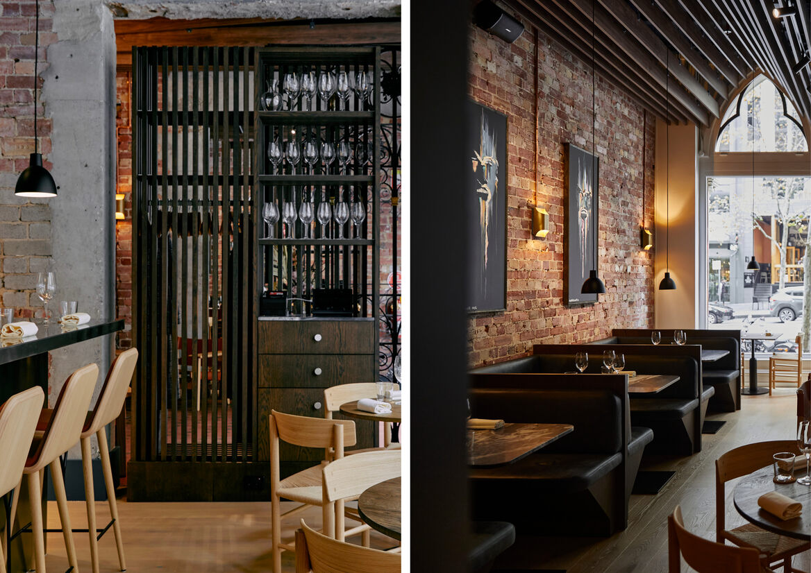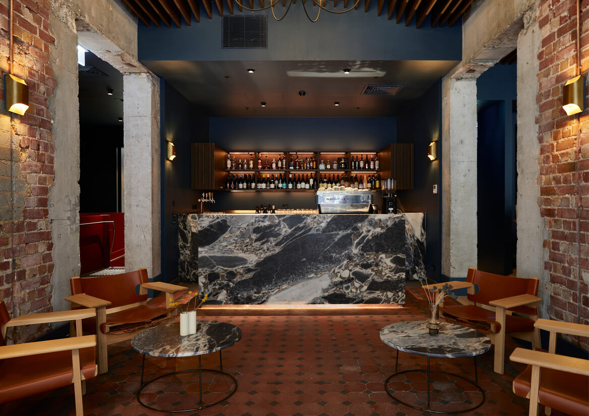 We introduced Scandinavian elements – simple, clean lines, a colour palette of ocean tones with hot accents, slatted timber on the ceiling that references Nordic maritime structures – to the design in a way that highlights the space’s architectural arches and heritage tiles and finishes. It respects the history of the building while creating an entirely contemporary backdrop for the star of the show: the menu.