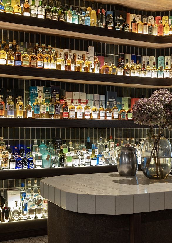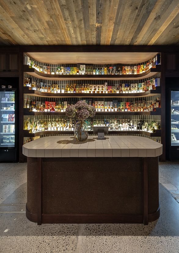 From the reclaimed timber ceiling to the antiqued oak cabinetry, material choices bring character and depth. The liquor wall acts as a visual anchor, its arched form lined with stepped riser shelving and softly backlit to echo the glow of a traditional back bar. A tiled counter in front invites interaction and adds a further hospitality touch. Across the room, the floor-to-ceiling, wall-to-wall wine retail display features a sliding ladder to encourage customer exploration.