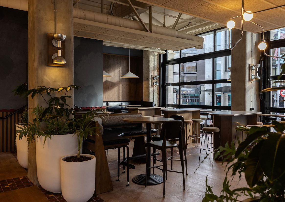 Design plays a central role in setting the tone. Materials are layered and tactile, with timber, textured fabrics and galvanized metal used to ground the space. A mirrored back bar and overhead wine display provide focal points, while tonal shifts in lighting and surface treatments create a dynamic atmosphere from morning coffee to evening cocktails. One of the venue’s defining features is a set of original mechanical windows that fold open to the street, inviting energy and connection from the city outside.