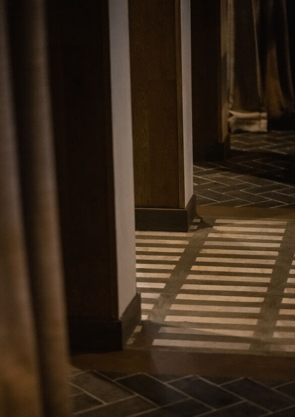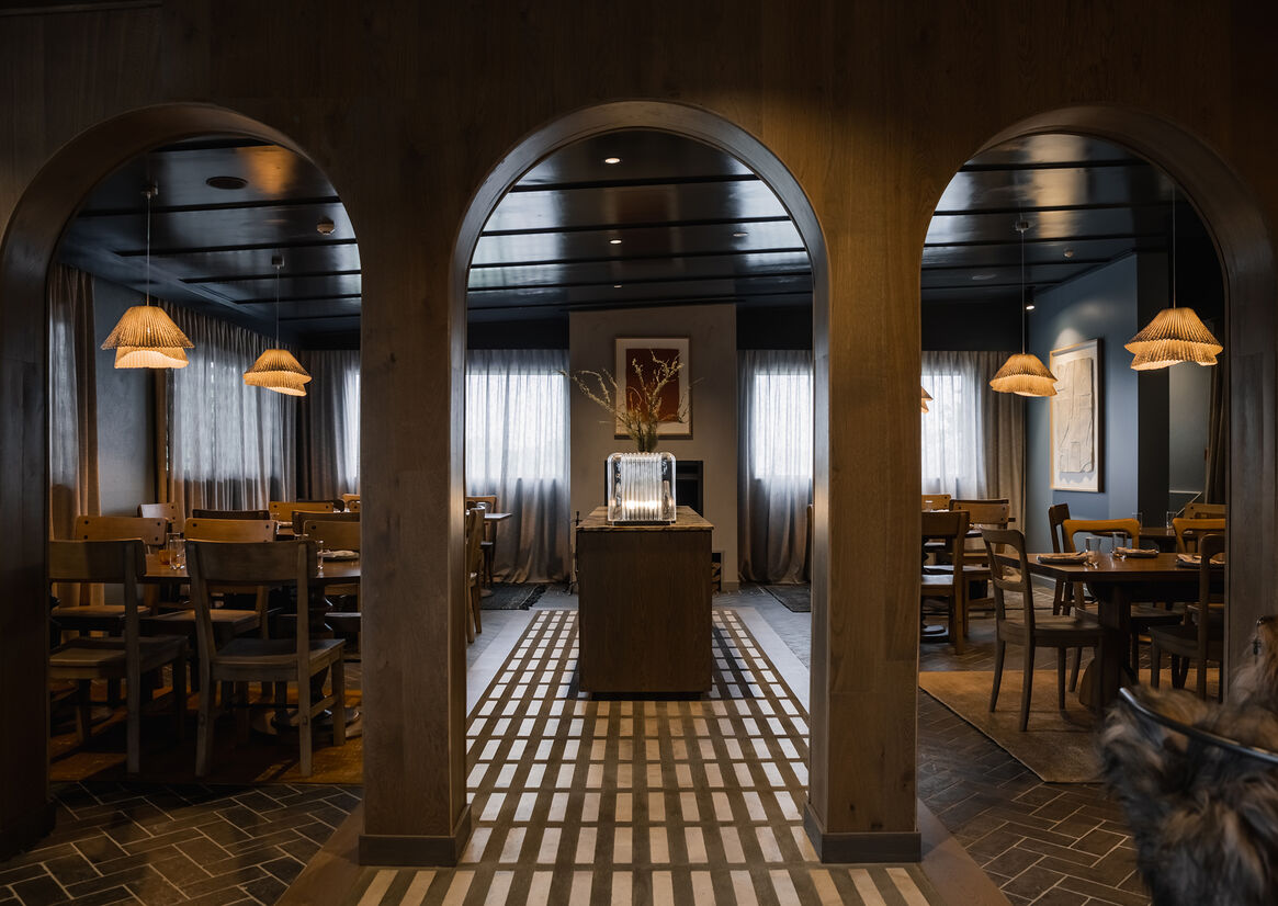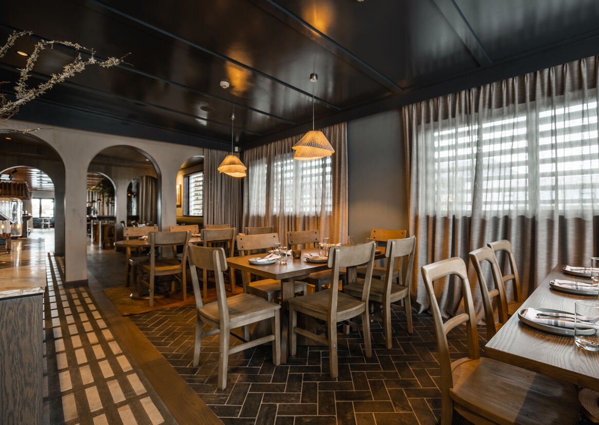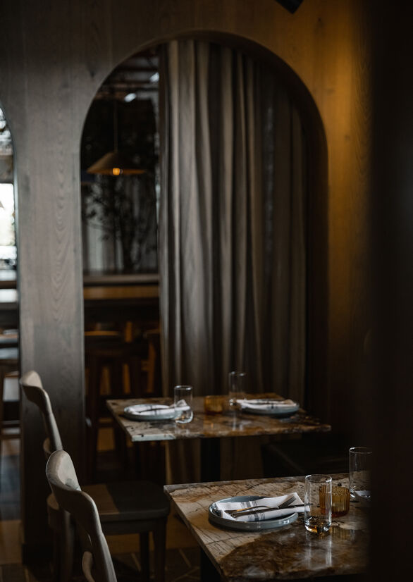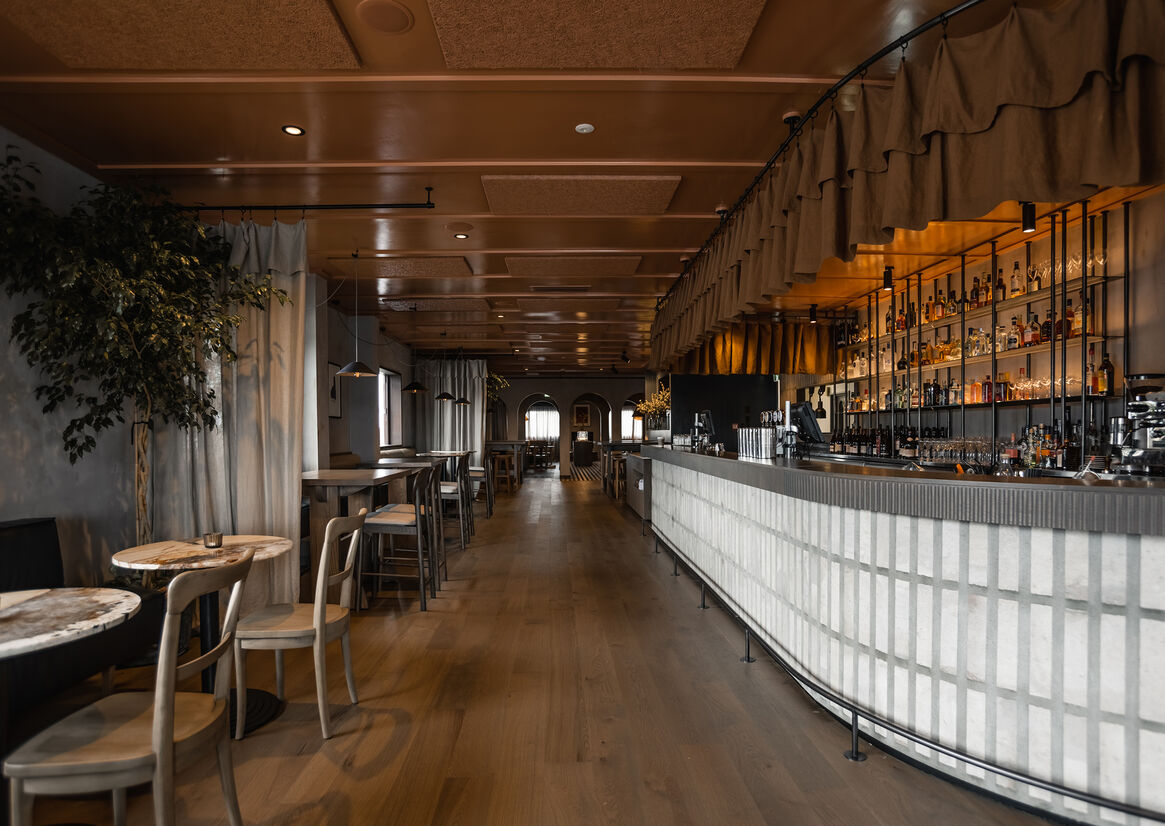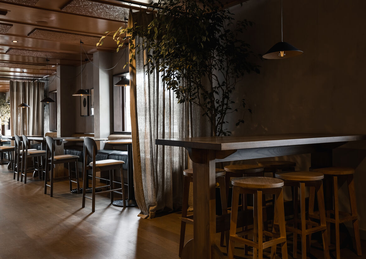 We wanted Siso to have a strong colour identity. The glossy terracotta ceiling brightens the space and helps reflect the light, creating a spacious feel. This colour is reinforced through the bar curtain, table cloths, rugs and artwork.