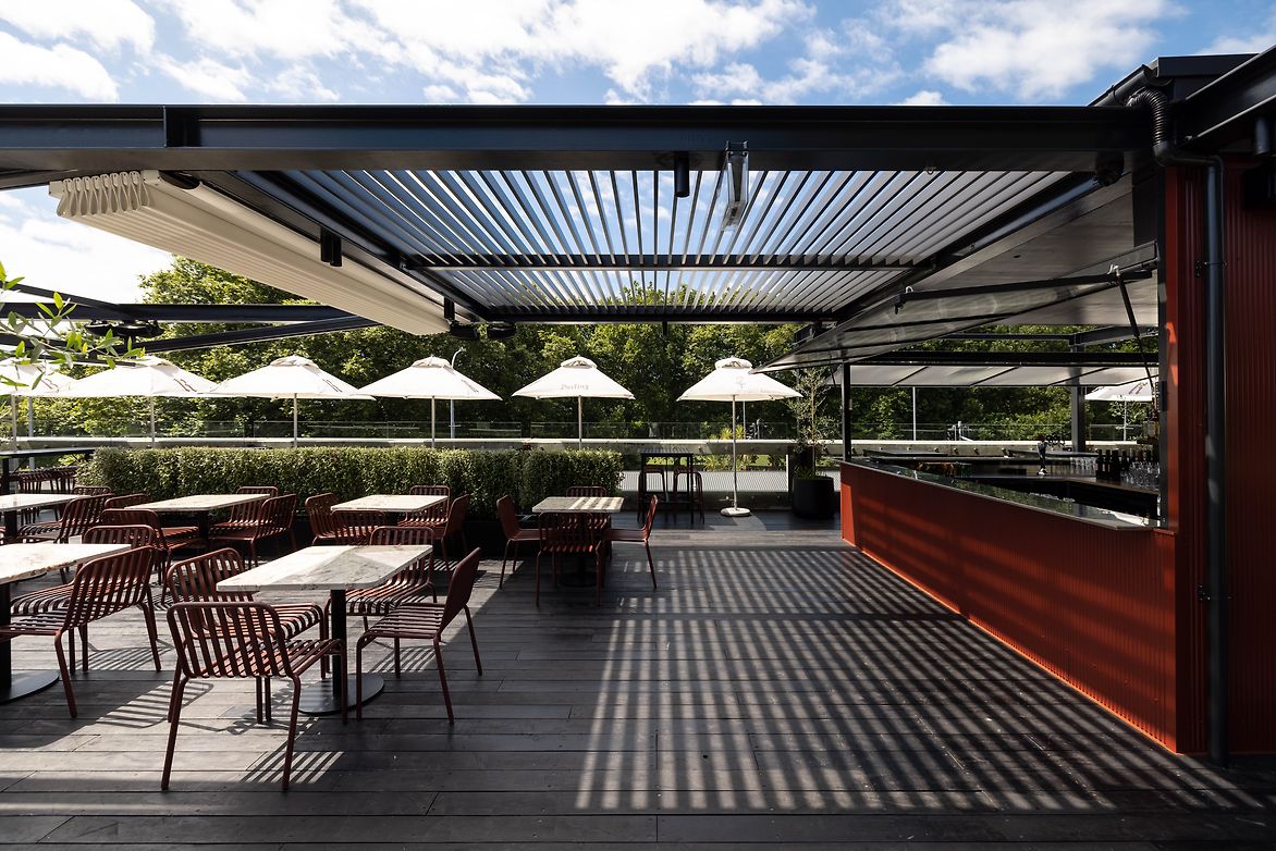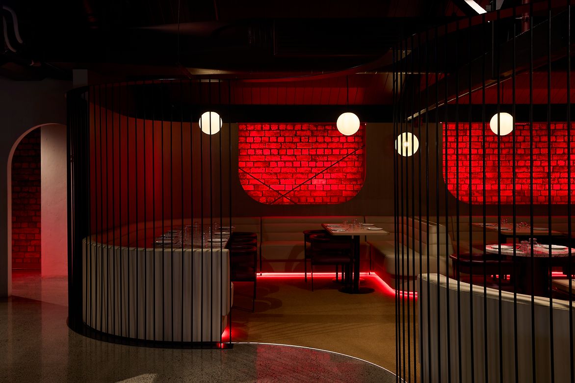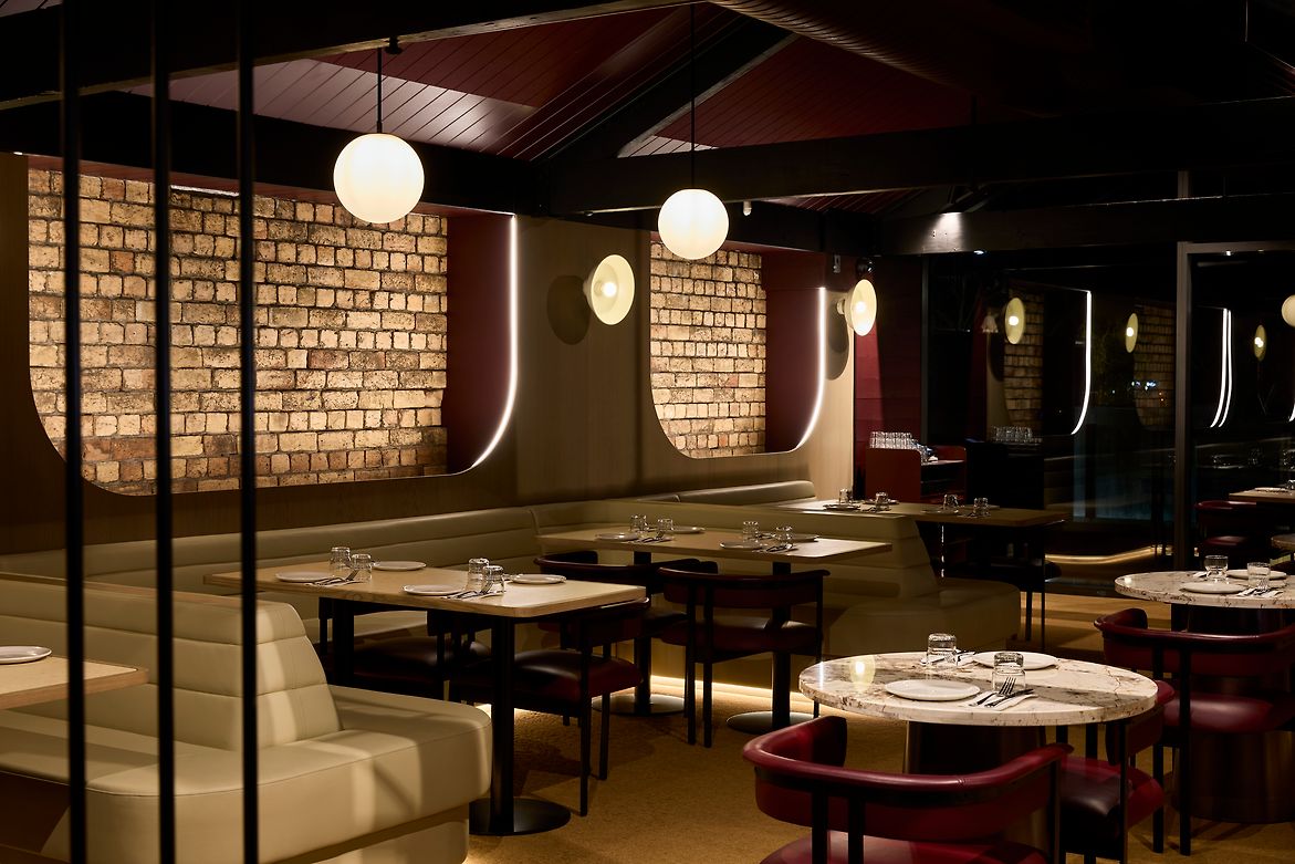 From the understated delineation between Darling's restaurant area and its bar via a simple, undulation partition, to the way in which the venue's lighting changes from golden tones to red tones to separate day service from evening service, the beauty of Darling's design is the way it offers customers a different experience with every visit, depending on what time they arrive, or whether they sit in the plush restaurant or wander out to the sprawling deck overlooking Victoria Park.