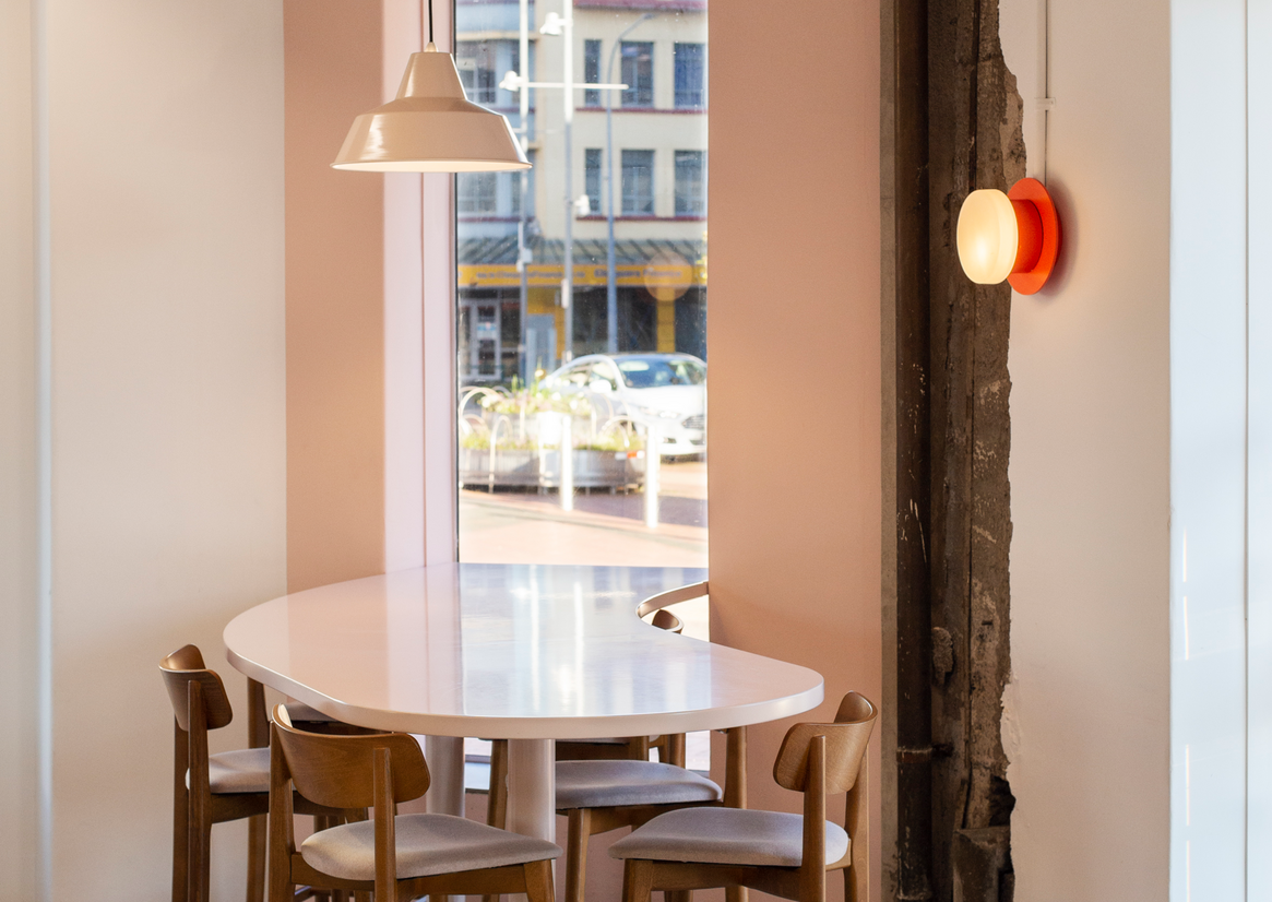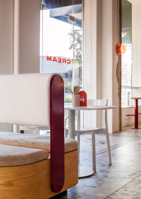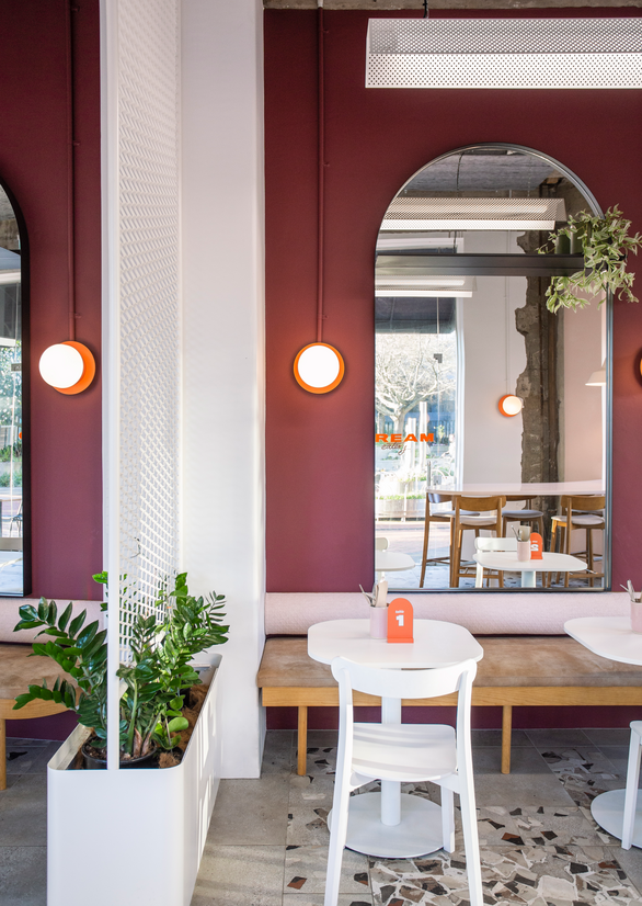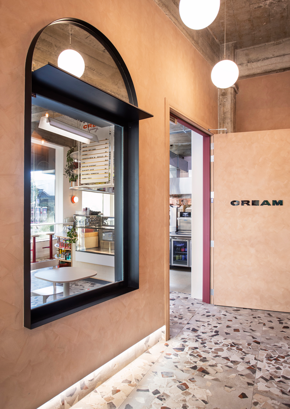 The aesthetic of Cream Eatery is balanced on a strong spatial expression of the brand story and the context of the 1950’s corner site building it’s located in. We utilized bold and delicate contrasts throughout the fit out and slightly offbeat but inviting colours to give a sense of personality and friendliness. The client desired a strong connection to the lobby of the deco inspired co-working venue adjacent, and so floor tiles, large windows, lighting and colour tones were bled from one space to the other to create a sense of flow and direction for customers.