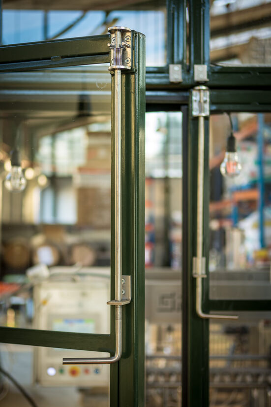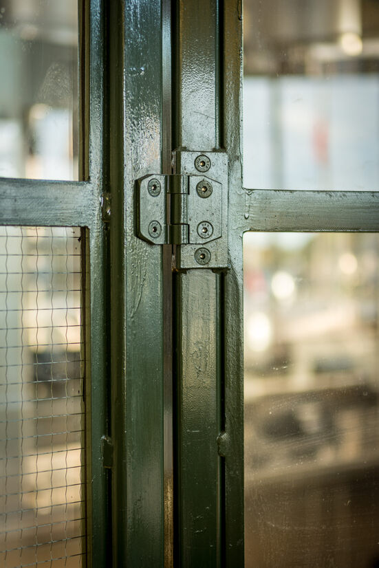 The glass panes in the dividing wall are glazed into a custom made painted steel frame. The panes are purposefully mismatched, georgian wire for some, greys for others - as if replaced over the years as breakages occurred. The fine steel joinery is welded up from scratch by those who manufactured the beer tanks. The latches are industrial, made to do the job year after year.