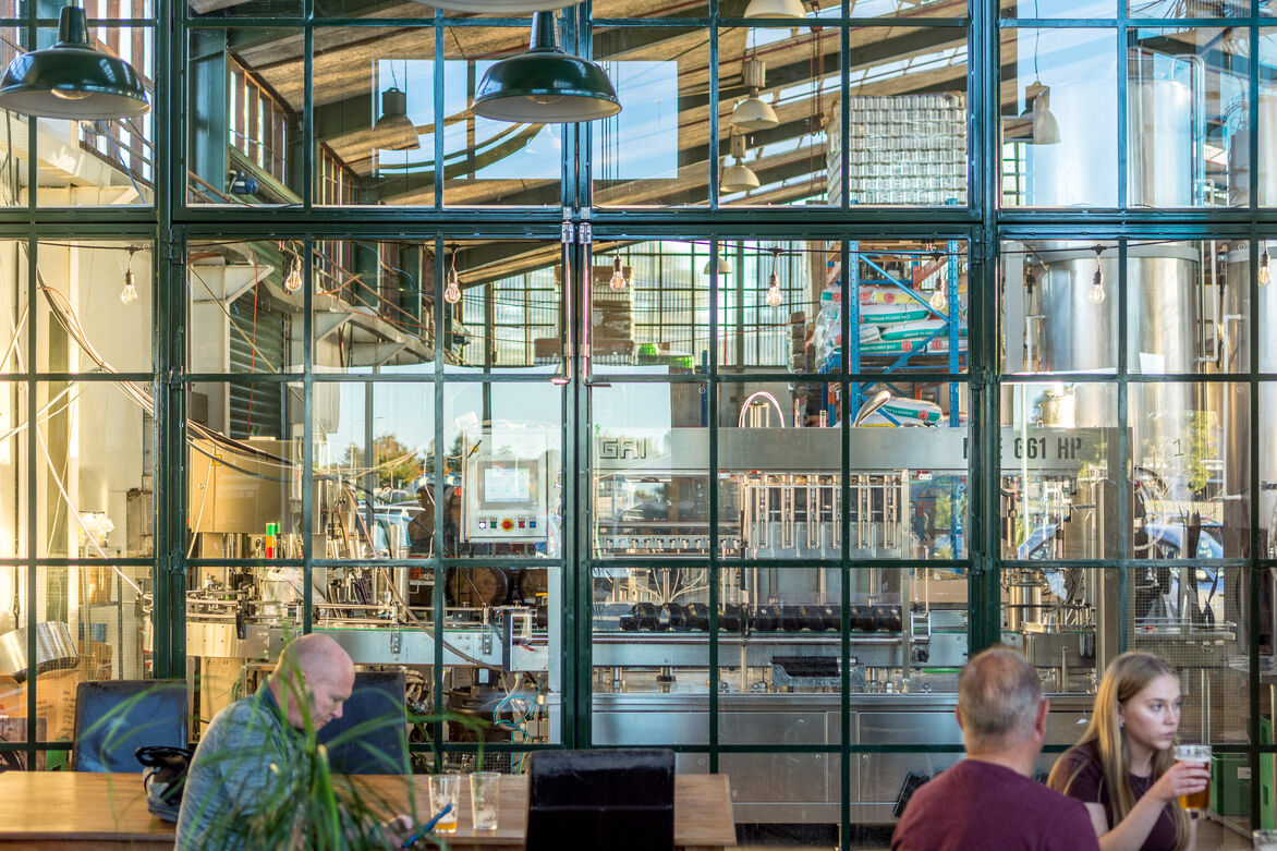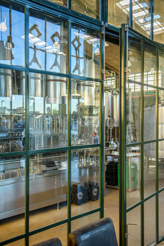 On entry you can see through to where the beer is being brewed through a large glazed wall - this connects the front of house to the brewery with hinged doors which are able to be swung back to show off the mechanisms of the brewery, or make space for the band on a Saturday night.