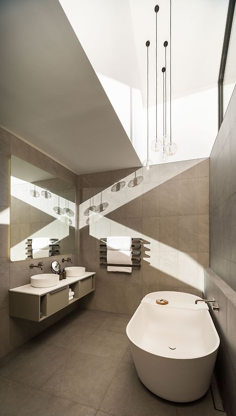 Bathrooms are pared back, offering a calming sanctuary flooded with natural light. Neutral grey tiles mirror the surrounding landscape — the rocky outcrops that define the Craigieburn Valley and the scree slopes that scar the surrounding peaks.