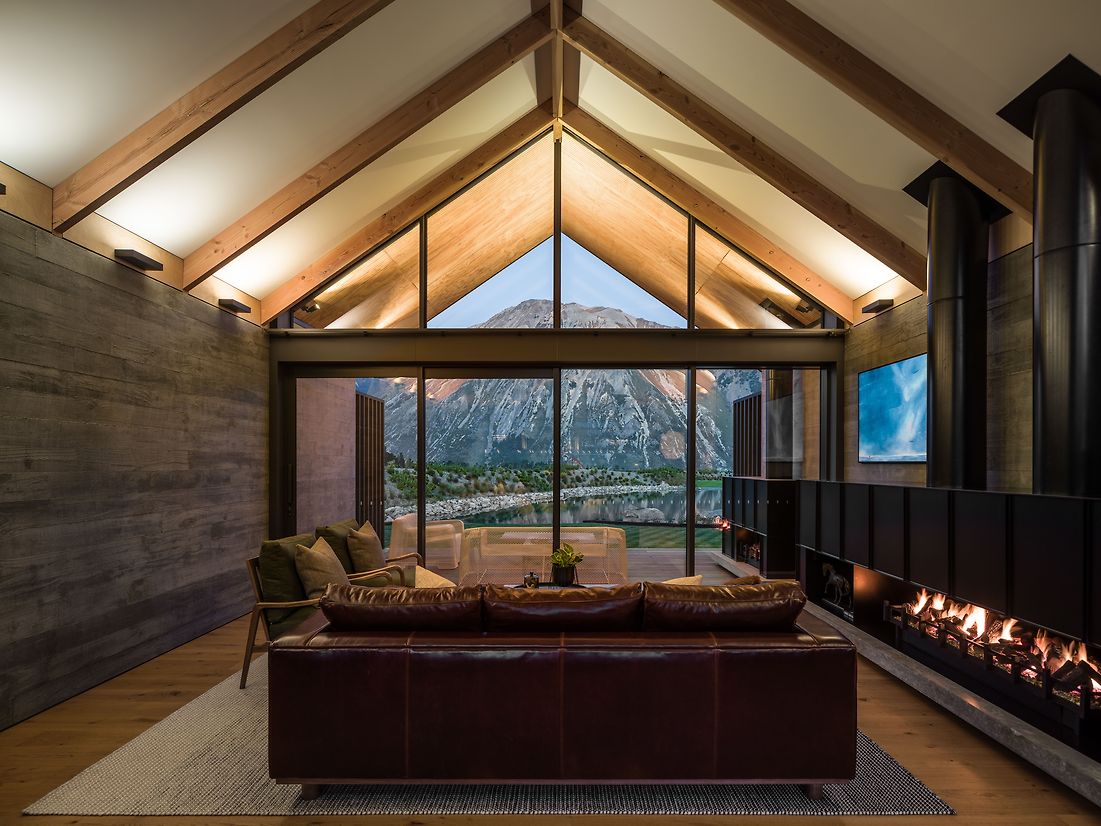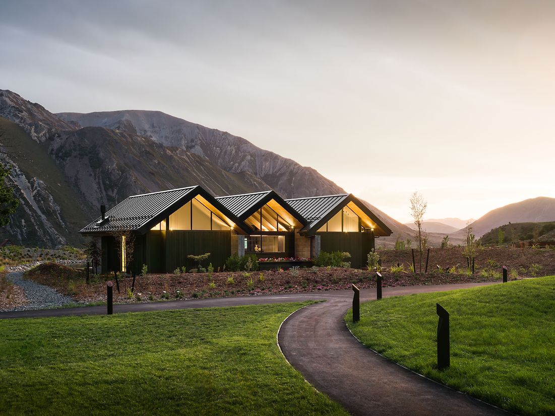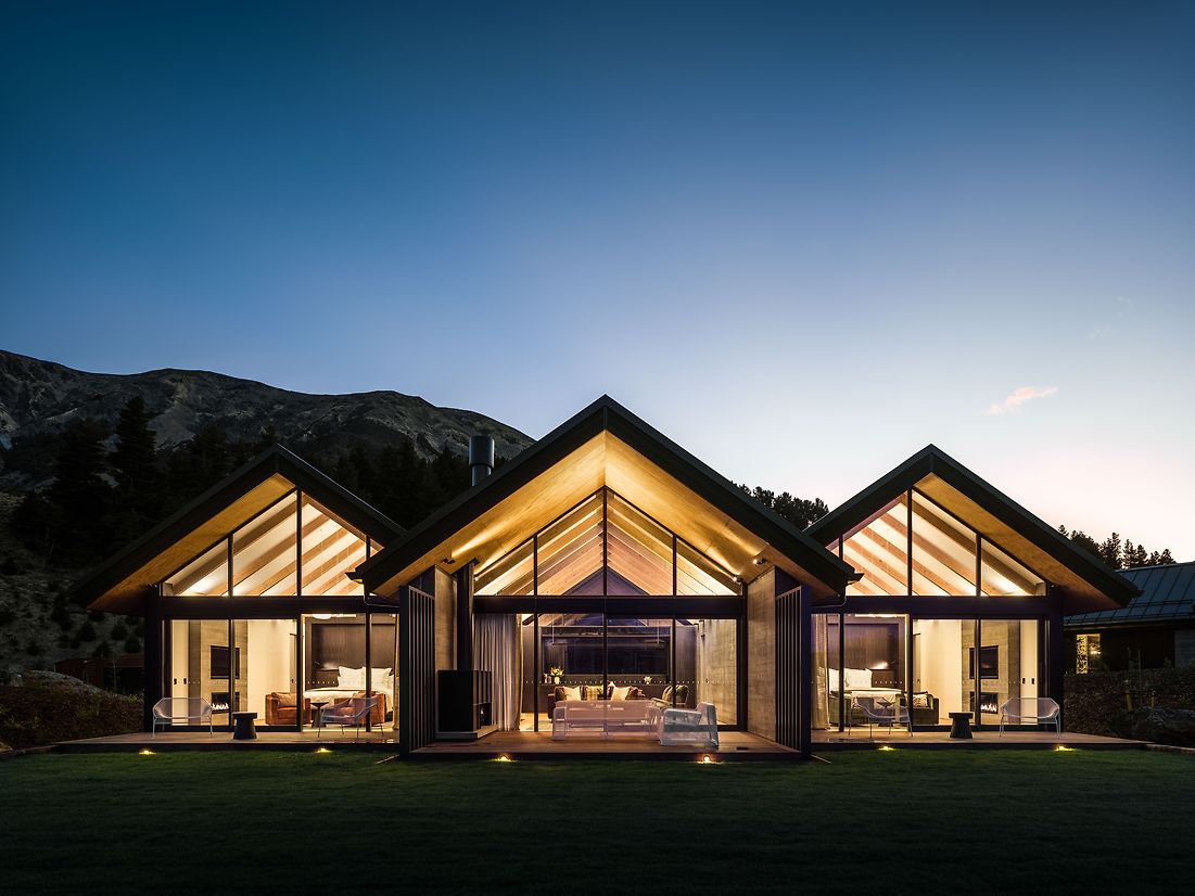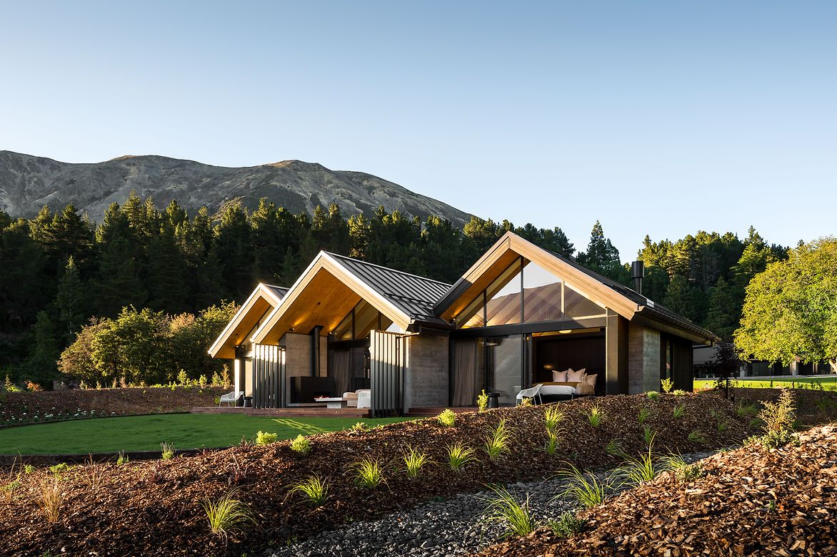The design response was a cluster of seven gable-roofed villas that reflect the layered peaks of the mountains. Nestled into the landscape, the villas are orientated to maximise privacy and seclusion, while capturing spectacular views beyond. Each consists of three volumes: a bedroom wing on either side of a central living and entertainment space, with guests able to choose whether to include the living space in their booking.