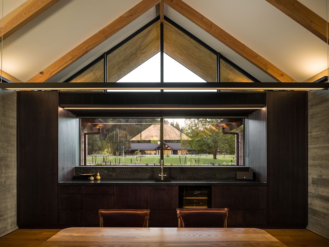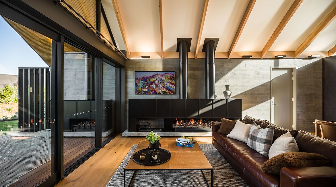 Exterior materials include dark-stained vertical timber cladding and precast concrete panels beneath a vaulted charcoal roof that appears to float above the solid walls. These finishes flow through to the interior, keeping the palette minimal, calming, and cohesive. The precast concrete walls pay homage to the rugged landscape while providing acoustic privacy, durability, and a low-maintenance finish. Standing seam roofs are engineered to withstand the site’s harsh alpine conditions, while vaulted ceilings and exposed rafters create a spacious interior with uninterrupted mountain views.