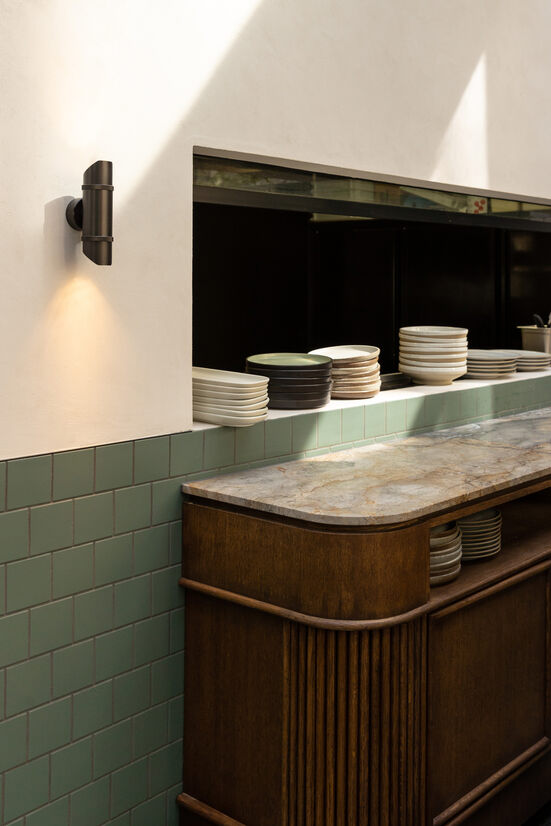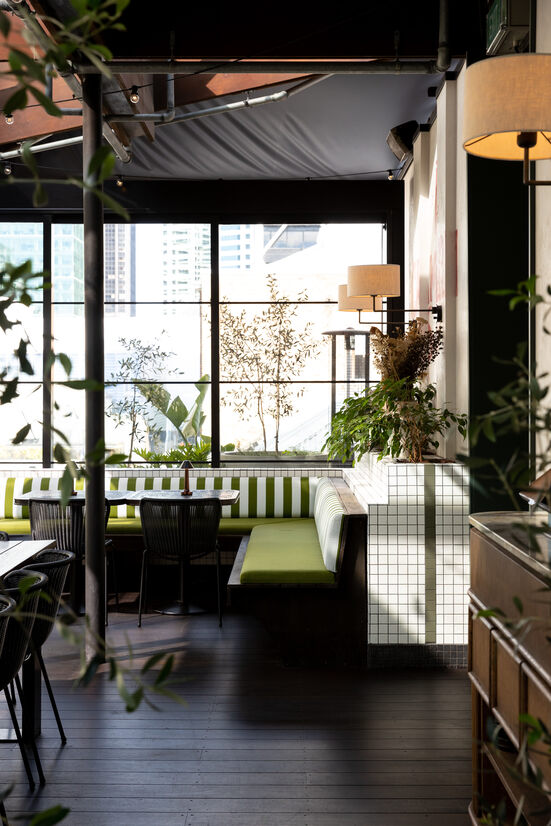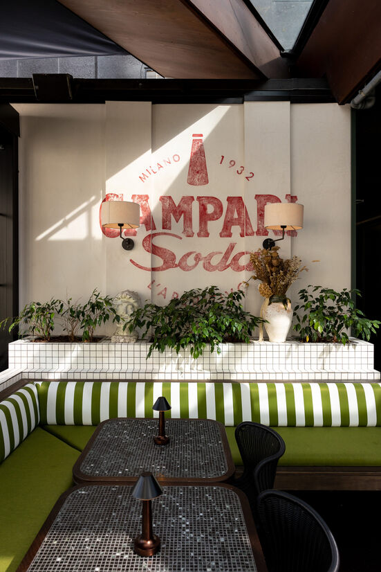 Inspired by the material palette of NSP Parnell, Bar Non Solo looks and feels more ‘inner-city cool’ than its neighbourhood classic counterpart. Inheriting industrial features such as a rough concrete ceiling and distressed timber floors, we endeavoured to continue NSP’s green palette, with a deeper, more olive-tinted hue. Leather upholstered booth seating, marble tiled table tops and walnut timber joinery were elevated with vibrant art, pottery and classic Italian produce. The iconic NSP green and white striped upholstery makes a return in the conservatory zone, surrounded by white micro tiles and a hand painted mural.