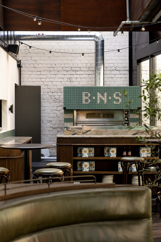 We wanted to evoke the feeling of an external Italian courtyard however this proved challenging within its internal corporate setting. Considerations such as the use of outdoor fabrics, planting and mood lighting were all used to overcome this and create the perfect indoor/outdoor setting. Another key feature of Bar Non Solo is the impressive pizza oven located in the corner of the venue. In true Italian fashion, the setting encourages guests to engage in a conversation with each other and the staff, while offering the opportunity to see and smell the fresh pizza being made on site.