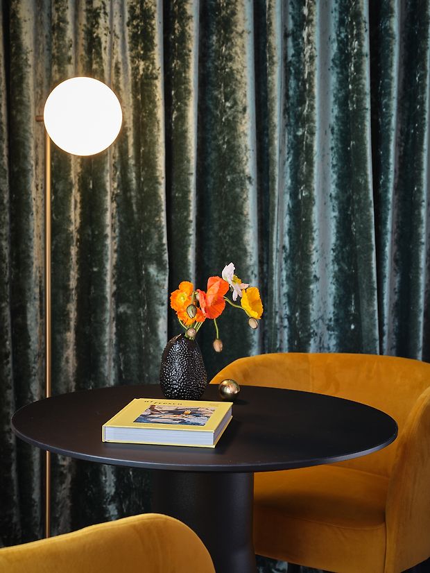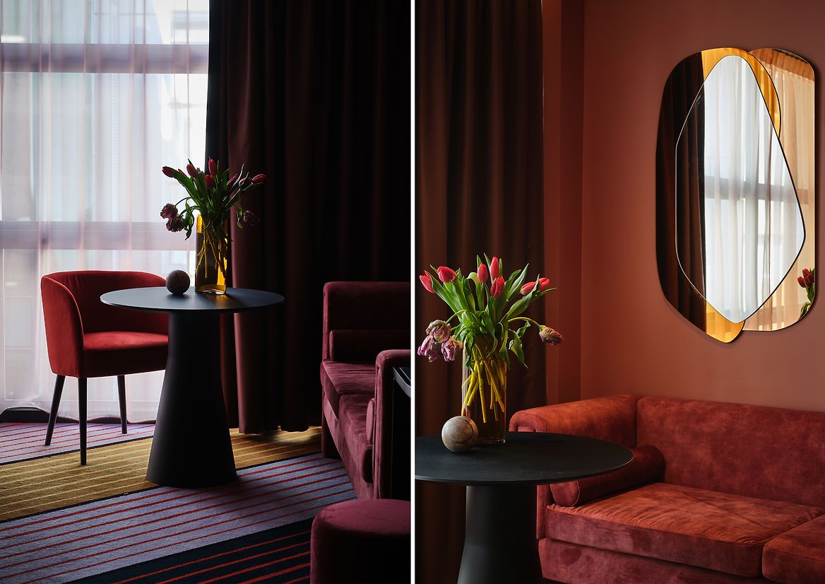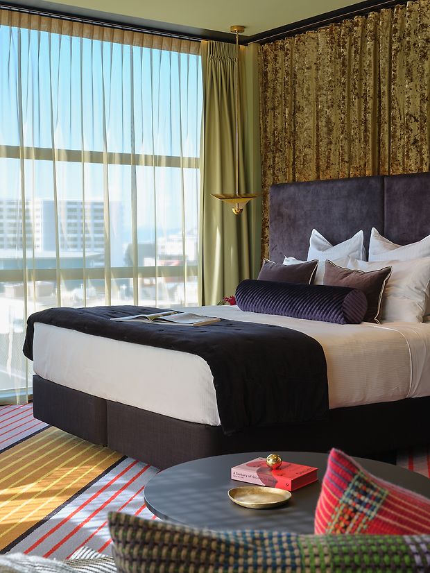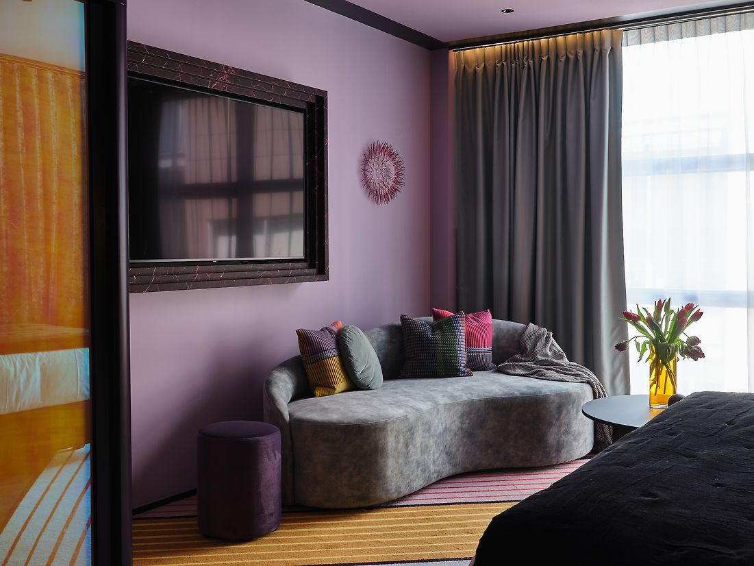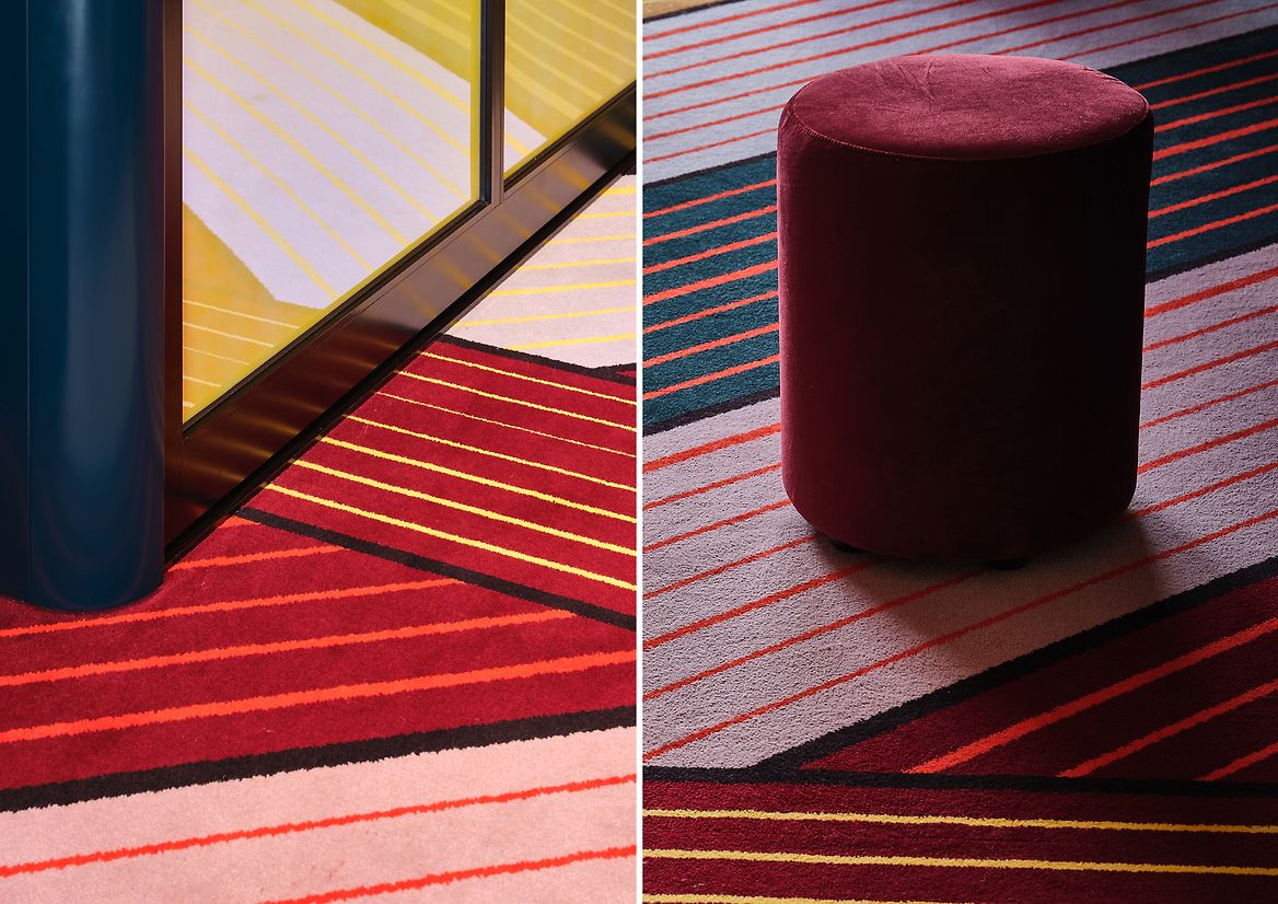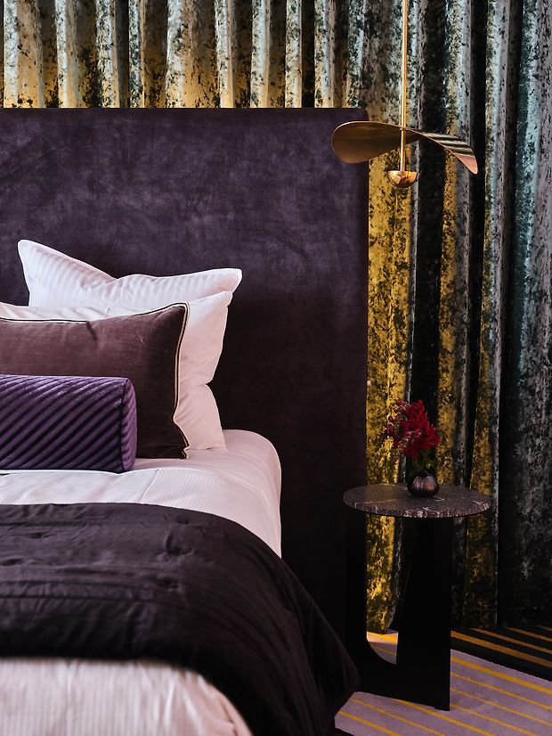 The colour palette reflects Naumi’s Essense – colourful, wild with a refined edge. Bold colour blocking in the rooms takes inspiration from nature: lilac, avocado, rust, subtle turmeric, the colours of a Wellington sunset tastefully clashing with contemporary diagonally striped carpet in bold colours. Contrast created by using a black trim around the perimeter of the rooms ceilings, adding a graphic architectural detail, nodding to the heritage Hotel side.