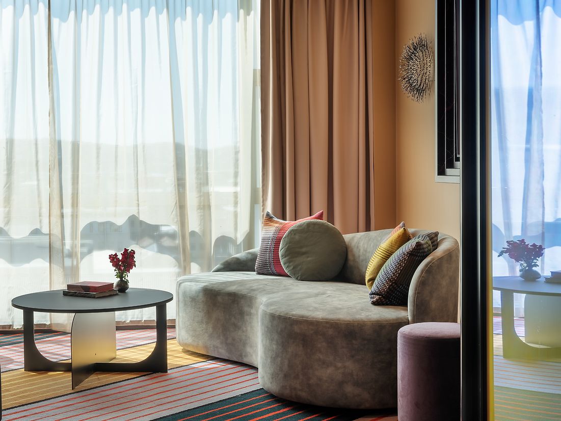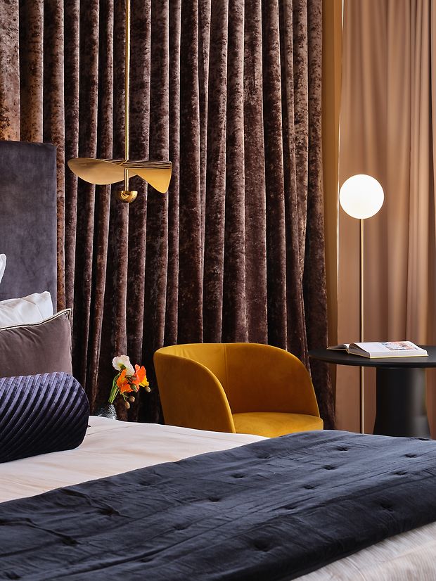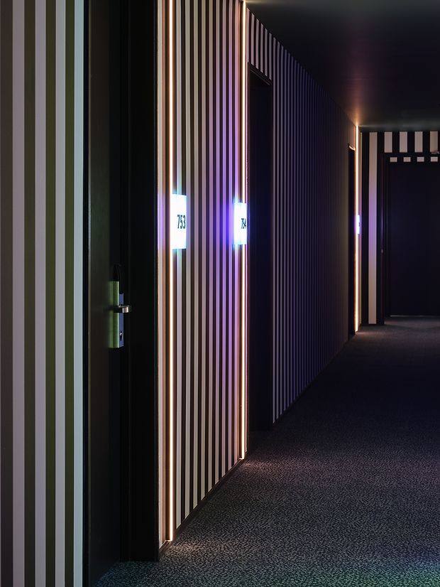 Embodying the eccentric luxe of Naumi, atmosphere is created by ephemeral lighting - brass droplet pendants from Swedish brand Ovature. Stripe carpet, a deep colour palette, geometric furniture and Iridescent screens that enclose the kitchenette & wardrobes, with a rainbowlike play of color – linking the colours over the 4 room types. Drapery & sheers line the walls to give an overall softness to the space. Graphic black & white striped wallpaper line the walls of the corridors with iridescent featured room signage.