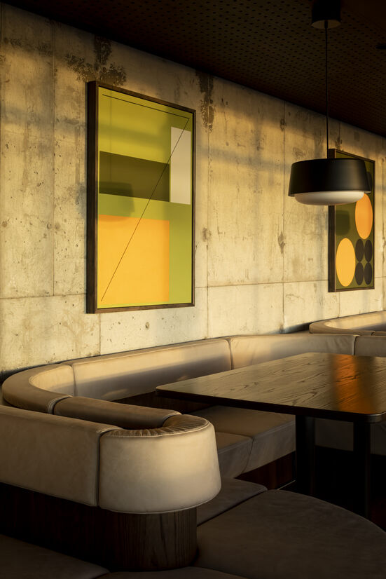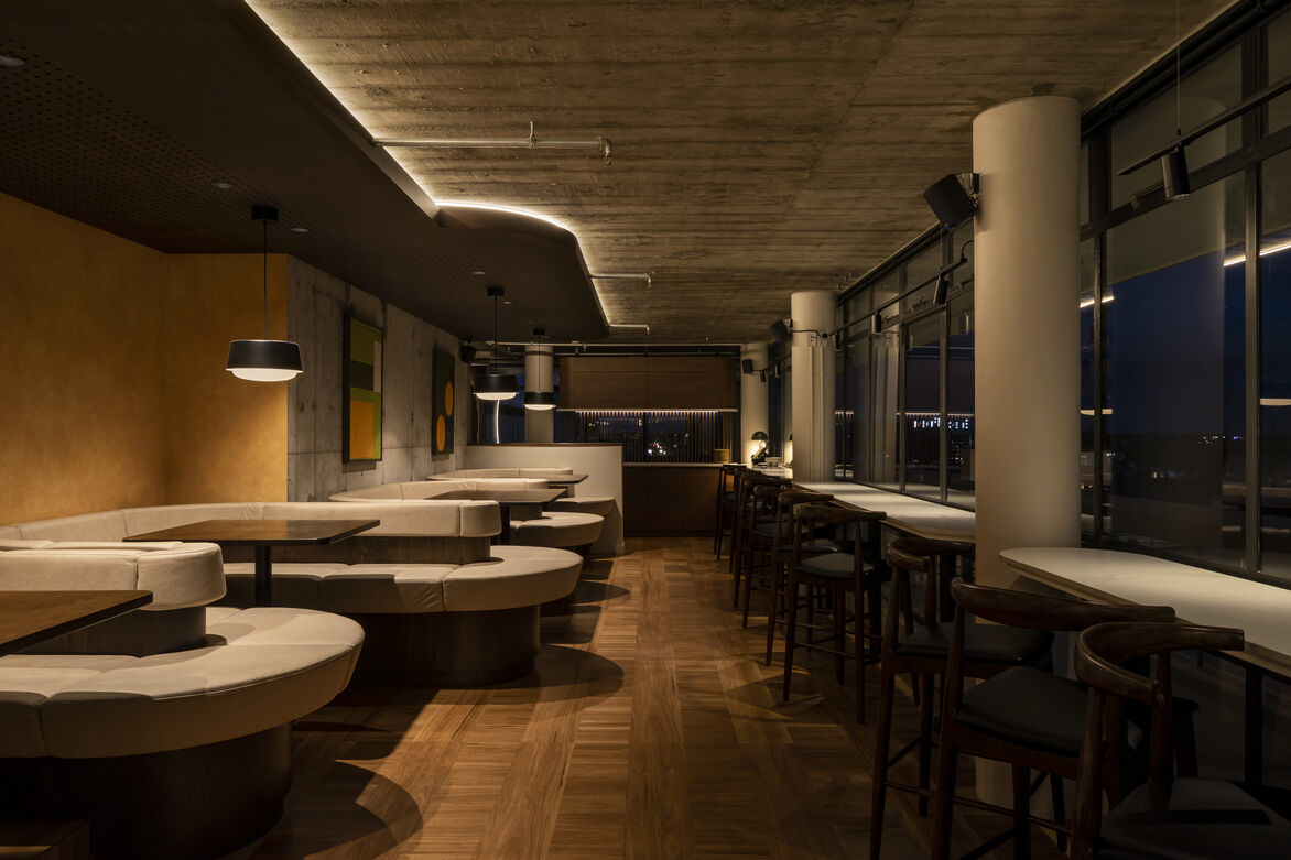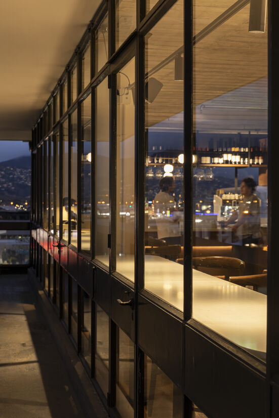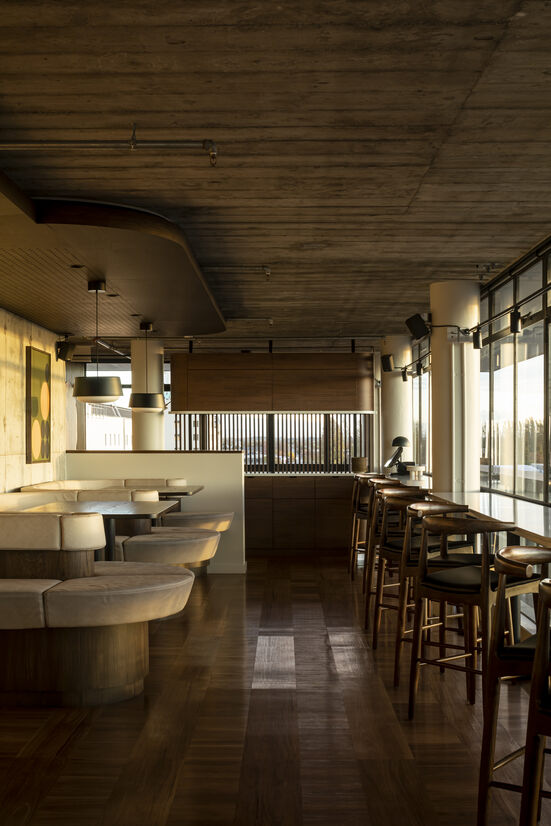 Rare for a building of its age, the architectural style, form and finishes have all been preserved in much of its original state. The seventh floor sits recessed below an overhanging concrete roof slab which appears to float above a complete surrounding of glass and steel joinery. We set about finding a balance between highlighting these features whilst giving the restaurant a style of its own, sympathetic to the era.
