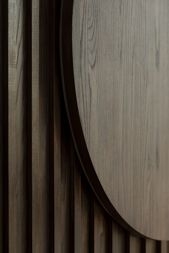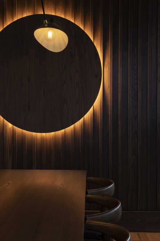 Beavens’ Modernist application of materials (concrete, steel, glass) result in a captivating yet brutal space. We added layers of warmth and softness through form, geometry and materials. Chocolatey hues of walnut, creamy tones of upholstery and curvaceous detailing are drawn out by dim, moody lighting creating a feeling of homeliness reminiscent of a domestic mid-century interior.