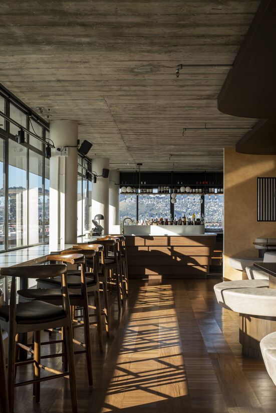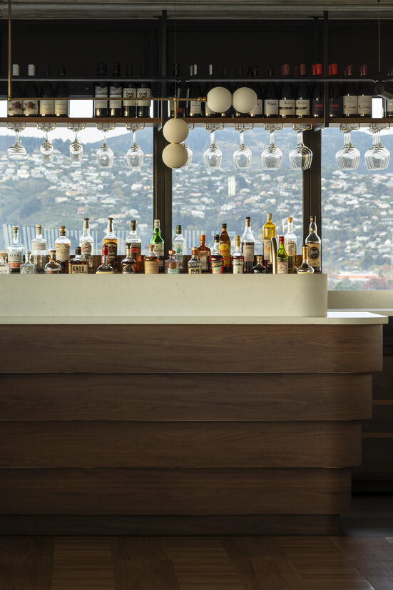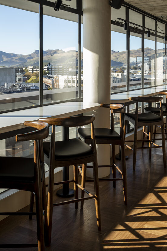 One of the key creative solutions is the 25 lineal meters of continuous booth seating. As it wraps the heavily textured structural concrete, it creates small pockets of cosy, intimate seating. Perched ever so slightly above the ‘date night’ leaners, it ensures every patron can enjoy the unadulterated views across Christchurch’s East frame whilst they experience one of the best offerings the city has to show.