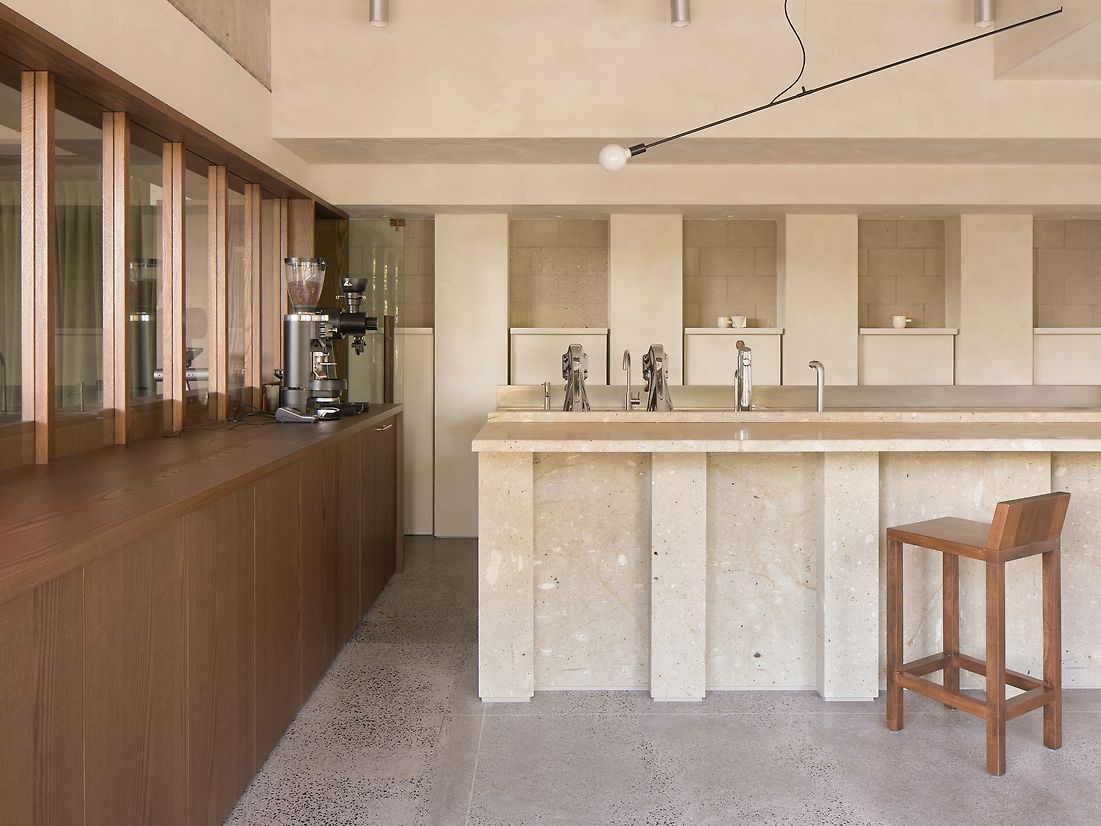 The centrepiece of this “residence” is a large Hinuera stone bench which showcases beautiful natural volcanic material from a nearby quarry in Cambridge. The Hinuera stone bench is flanked at each end by warm custom timber cabinetry. At one end open shelving floats from an Ostumigaki plastered wall, and at the other the same warm timber takes the form of a multi-purpose interior partition, providing storage, a work top, frameless glazed door access to the roastery as well as a glazed view to the roastery and its inner workings.