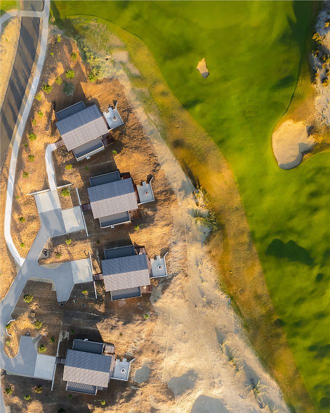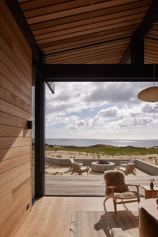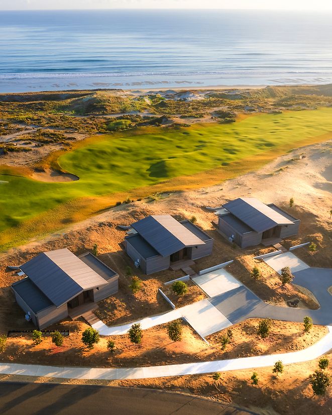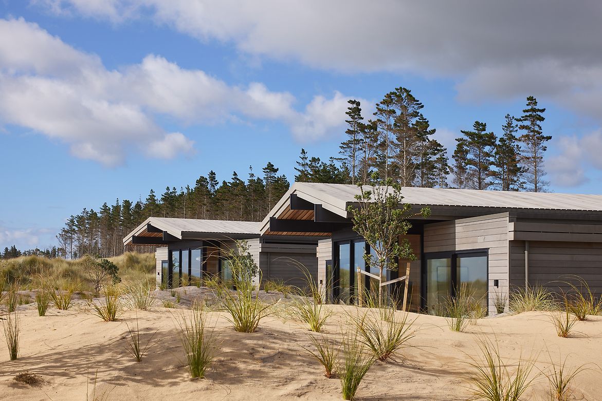 The Cottages are two-bedroom accommodation units at the Te Arai Links golf course. The client's brief was to design buildings that blended seamlessly along the course, natural and unobtrusive. The units were to feel luxurious, cosy, warm and inviting. Facing north-east to capture the light, the Cottages have jaw-dropping views of the course and the Pacific Ocean