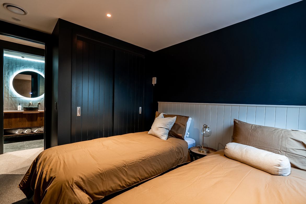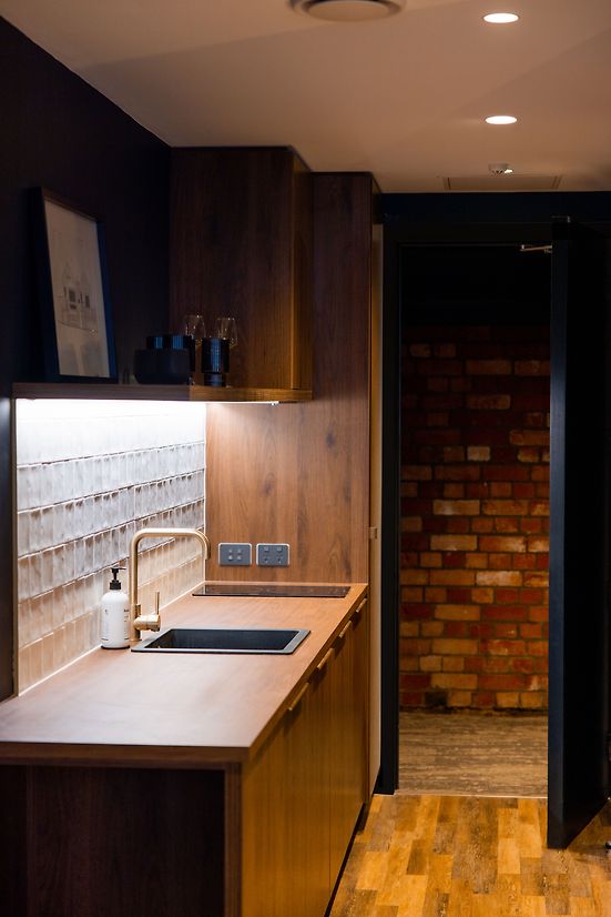 The mood extends into the bathrooms where the dark colour palette is replicated with industrial black and grey tiles and again softened with the warm cabinetry, brushed gold fittings and moody accent lighting.