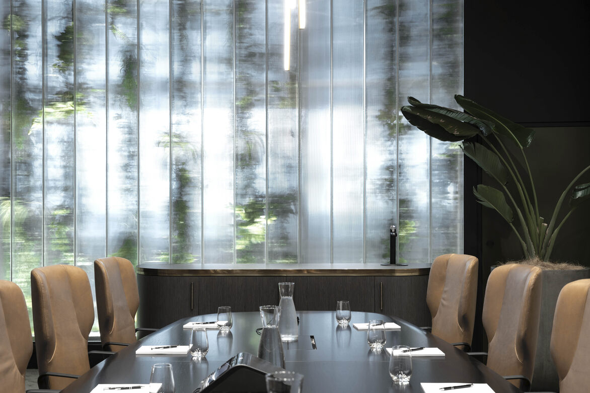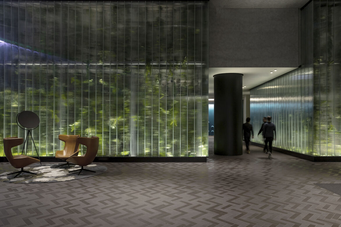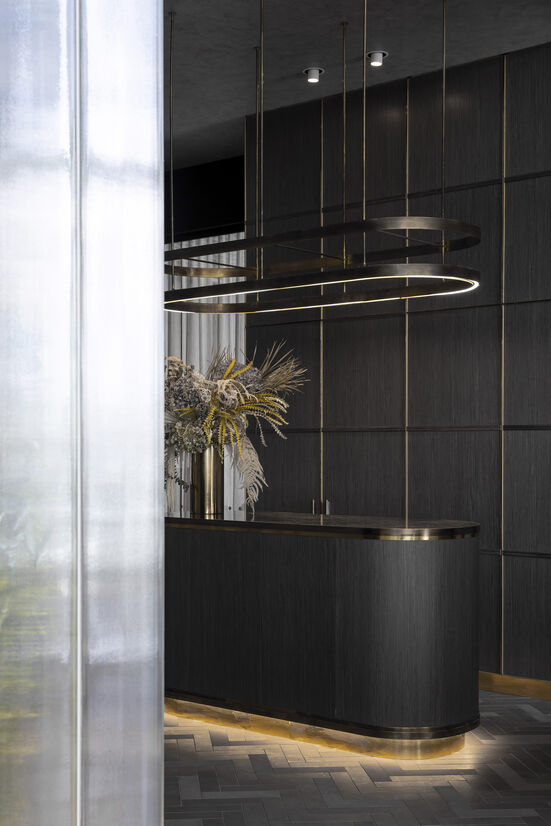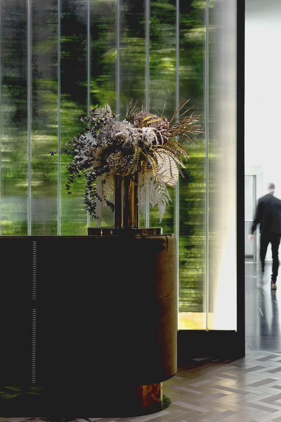 As a counterpoint to imperious and corporate lobbies of the past, the space has a soft approachable aesthetic with a focus on drama and elegance. The palette of materials blends high-quality metals, honed stones, and plush soft seating, anchored by the tall, elegant cast glass columns to the rear. The large volume needed to absorb and soften floods of natural - achieved through the grey tones to the ceilings and all surfaces being honed, avoiding reflectivity. Planting and joinery refocus the space around the rotunda, creating a dramatic central ‘green bowl’. Large planters on the ground floor will fill the void with foliage over time with its glowing glasshouses: A wintergarden wonderland.