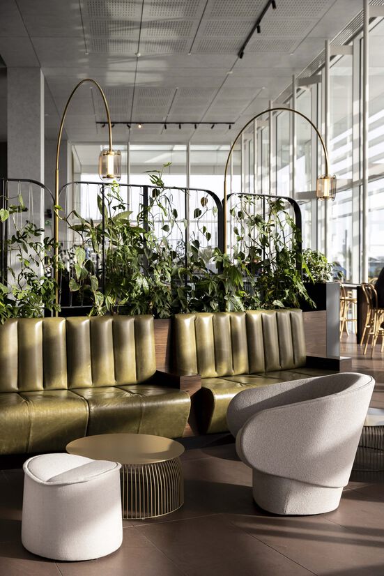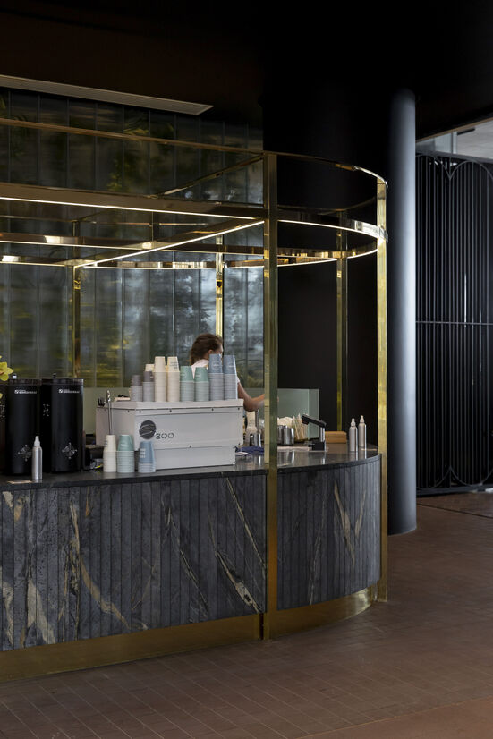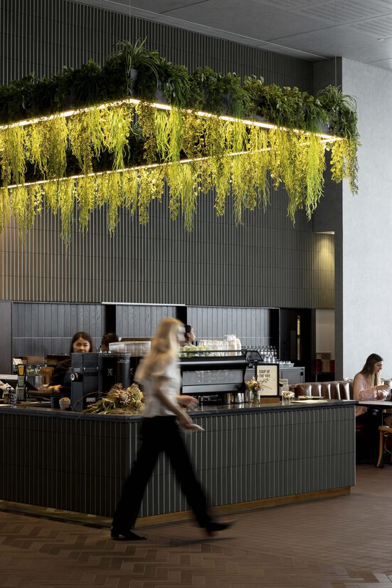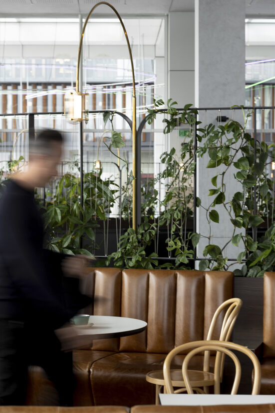 Under the ‘Wintergarden’ narrative, we introduced giant glowing ‘glasshouses’ to anchor the space, supported by a division of the lobby into three zones: work, meet and eat. Each is underpinned by its primary task; the eat zone serves dual purpose - a grab and go kiosk by the adjacent link bridge and a more formal café to the main lobby. The café is the busiest in Mojo’s portfolio and needed to offer a morning through lunch table service, with the ability to grab an early evening drink and enjoy the outlook. The café seats 100 for full breakfast and lunch service, with the kiosk taking on the abundant flow of morning coffee traffic to enable a diversion of the patronage.
