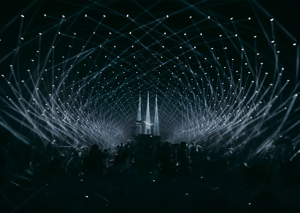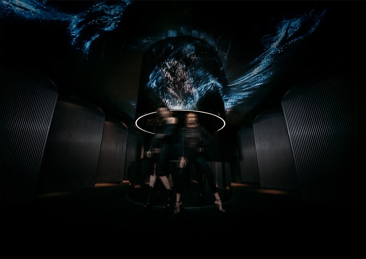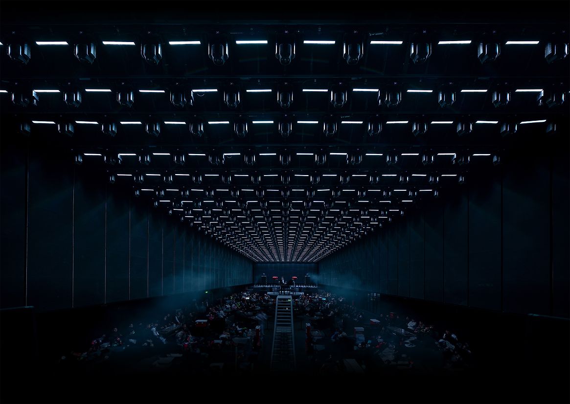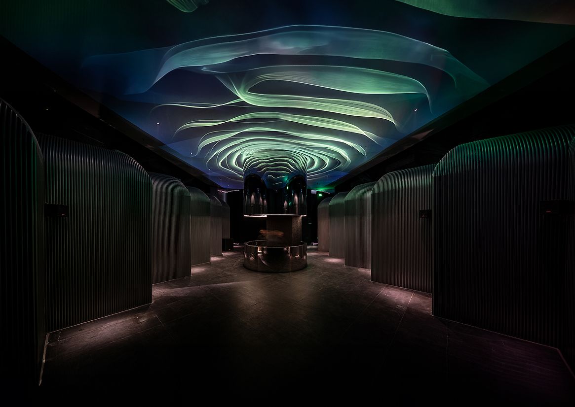 The main room boasts a directional sound system of 200 treble speakers to create 3D sound, paired with VOID Soundsystem for mid-range and bass. 96 triangular shaped rotating wall panels totalling 674sqm clad the walls and comprise: P3 LED screen on one face , mirror on other face and 6 moving head lights on the 3rd face - thus 576 lights in the wall panels alone, together with the lasers, haze machines, sound system and wild ceiling it is quite a mix of equipment to put on incredible shows. There are 2 stages as well as a central movable performance platform for 360-degree artist performances.