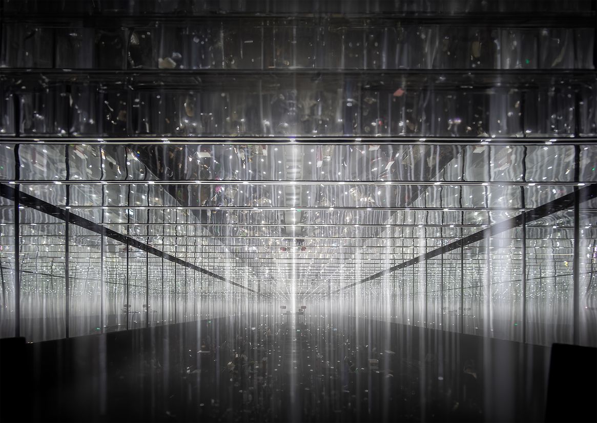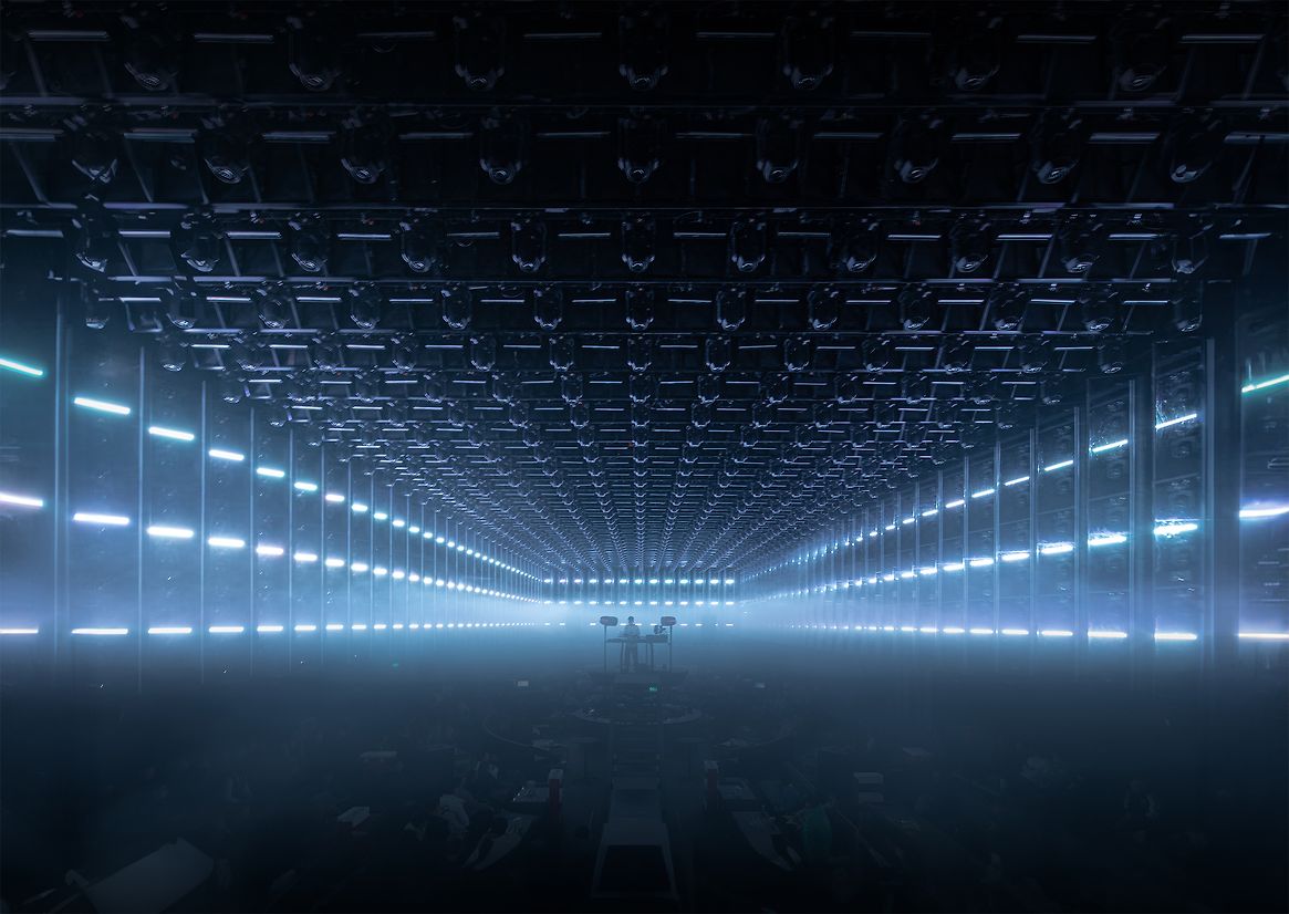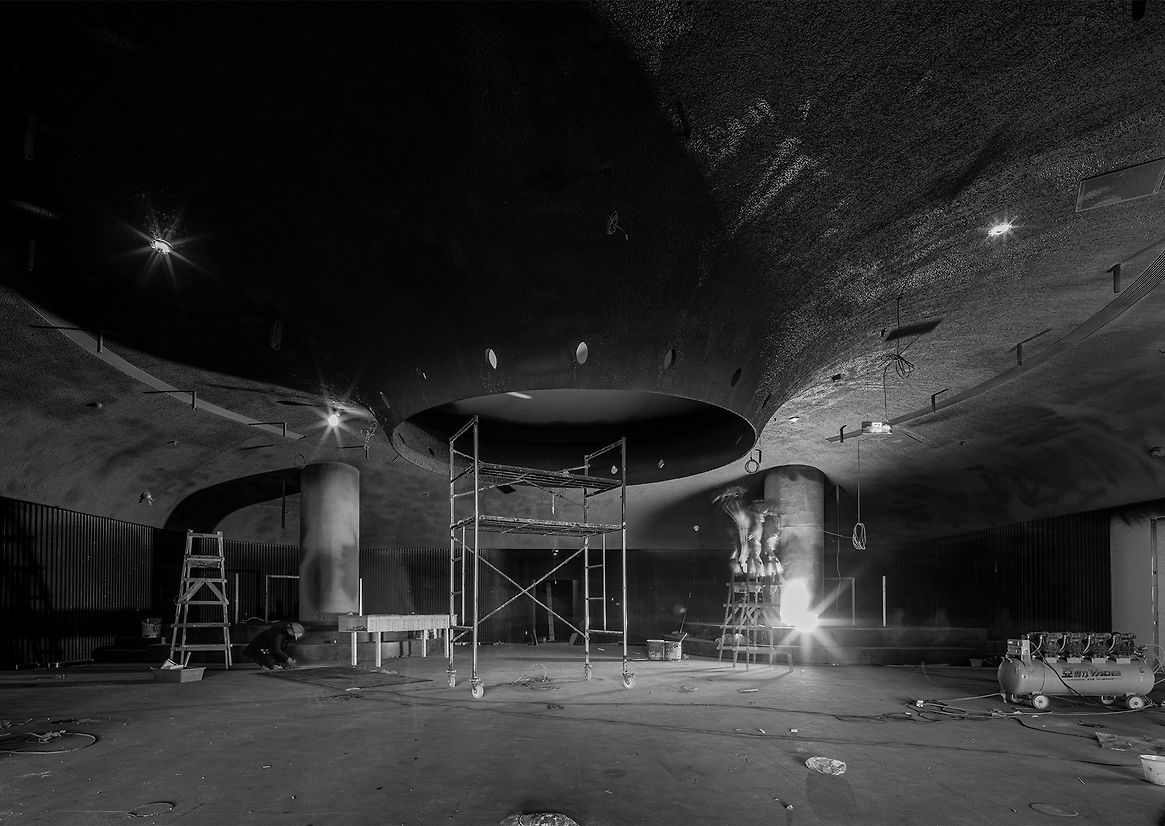 F5 was born - 3,500sqm of retail, bars, restaurants, KTV suites and a series of event spaces culminating in the main 800sqm space. We excavated in the existing long span space to provide an additional 1.5m headroom to give an impressive 10m ceiling height to accommodate enough AV equipment for a Beyonce concert. 800sqm operable mirrored ceiling comprising 42 panels that tilt and move in concert with 588 moving head lights that are exposed once the mirrors tilt. The ceiling is flanked on four sides by rotating wall panels of lights, more mirror and LED screens that offer great flexibility for event production.