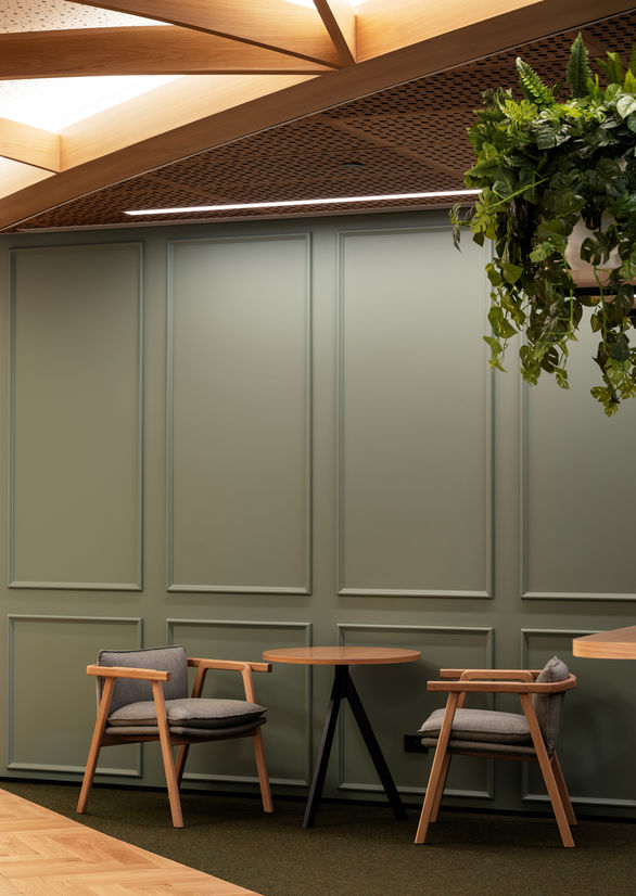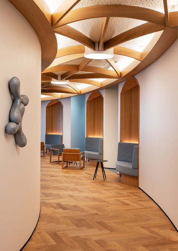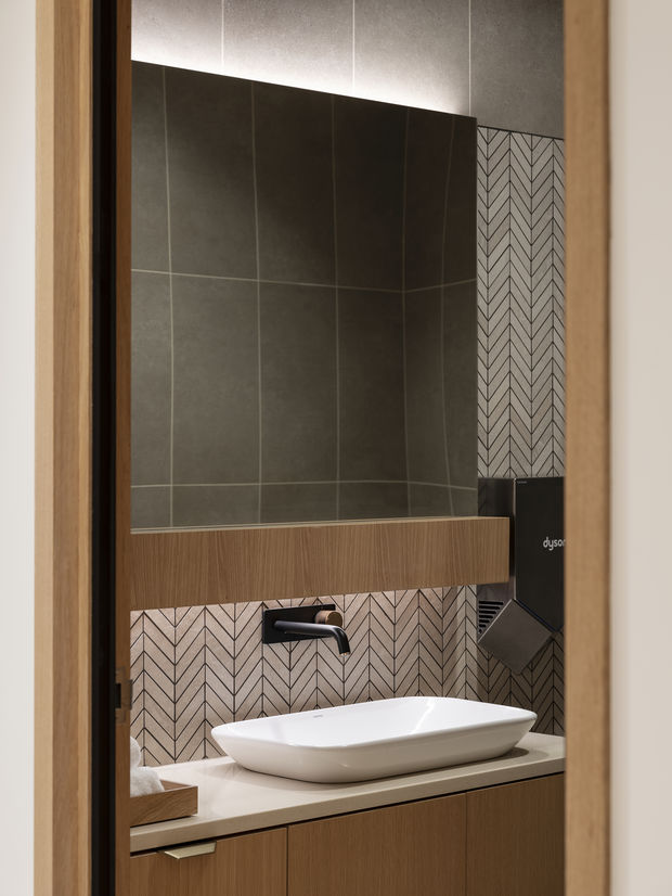 Cove lighting was used throughout the space to create a diffusive and ethereal user experience while accentuating the curvature and architectural features of the space. The indirect lighting effect from the cove lighting adds grace to the overall lightness of the design and encourages exploration of other aspects of the space. The correlated colour temperature for the cove and general lighting, a warm white at 3000K, was chosen to exude a sense of warmth to the space and complement the rich timber aesthetic.
