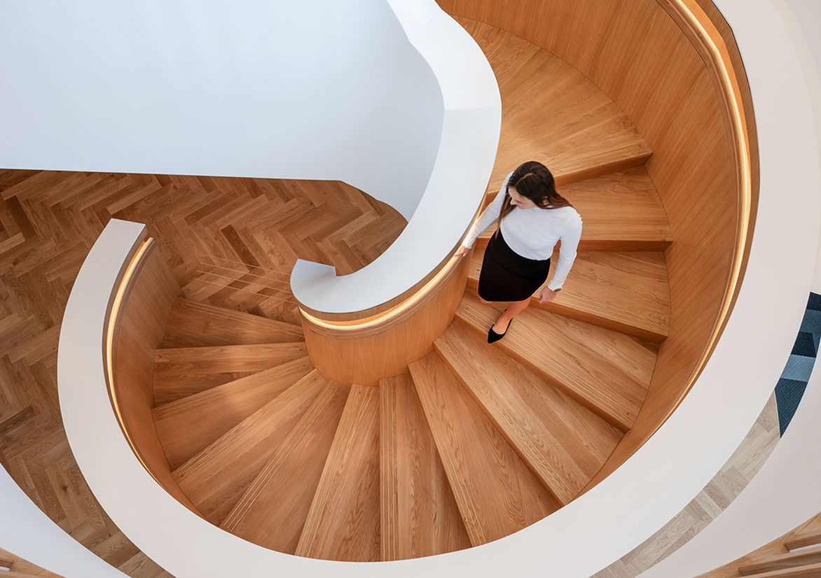 The lighting design was driven by two key lighting techniques which included cove lighting to the feature ceiling, furniture, seating, and the curved handrail of the feature stair as well as backlighting the feature Laminex Solid Surfaces wall.