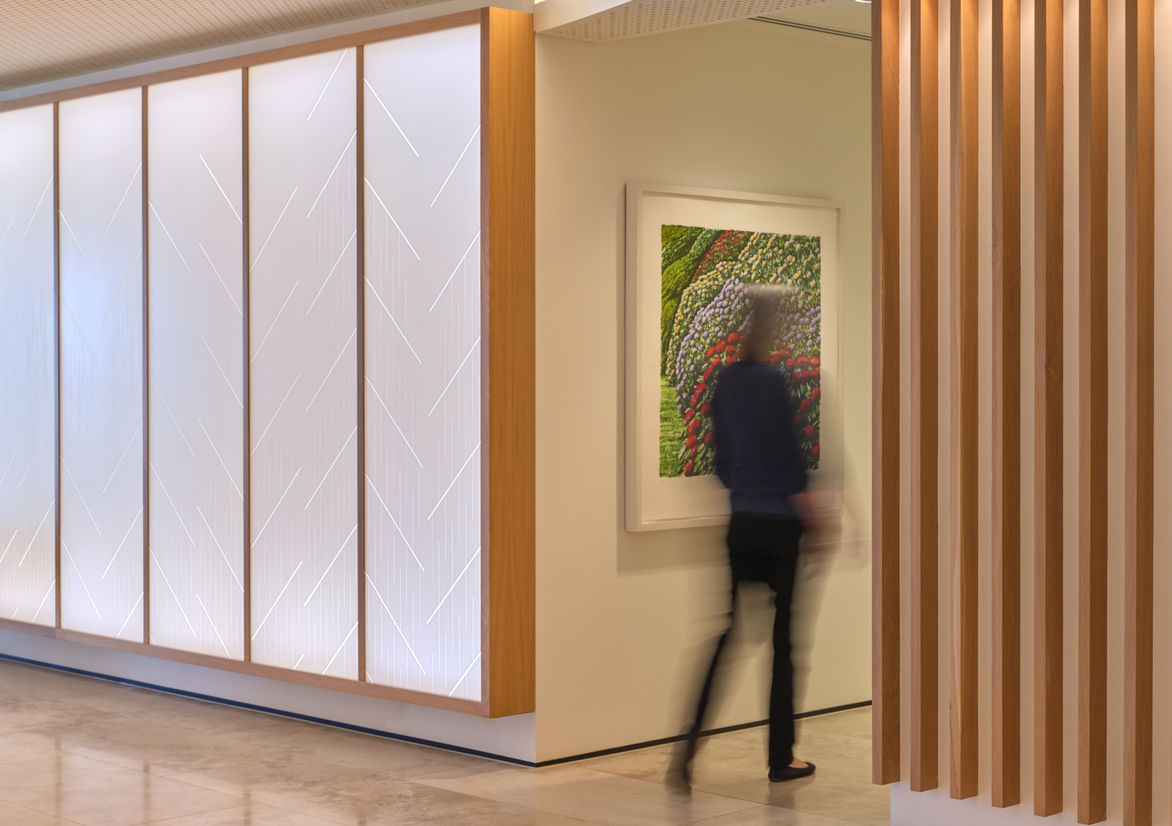The backlit Laminex Solid Surfaces feature wall is a global element in all DLA Piper offices across the world. The feature wall is etched with an imprint of an abstract fern pattern which embodies New Zealand‘s local flora. A RGB backlight solution located at the top and bottom of each Solid Surface wall panel explores texture and light as an inviting and welcoming experience. A lighting controller for the wall was provided for the creation of customised lighting scenes and colour gradients for special events unique to the space.