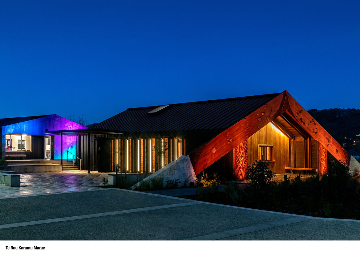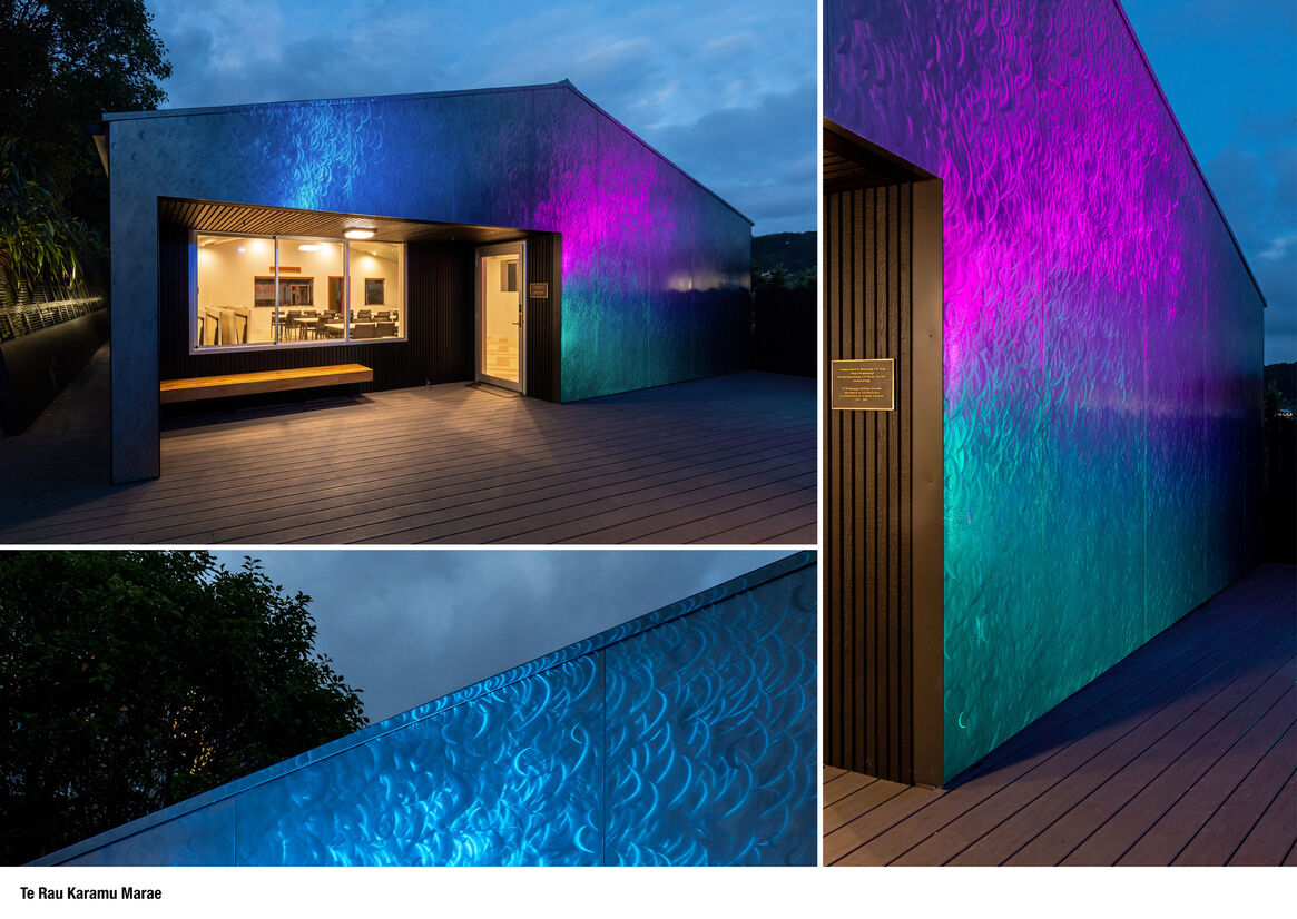 The wharekai ‘Te Whaioranga o Te Taiao’ sits within the zone of Te Moananui (the great ocean). The front-facing exterior wall represents Tangaroa (the atua who created the potential of animation for all beings). The outdoor lighting programmed and positioned to activate the shimmering steel expanse in dynamic expression.