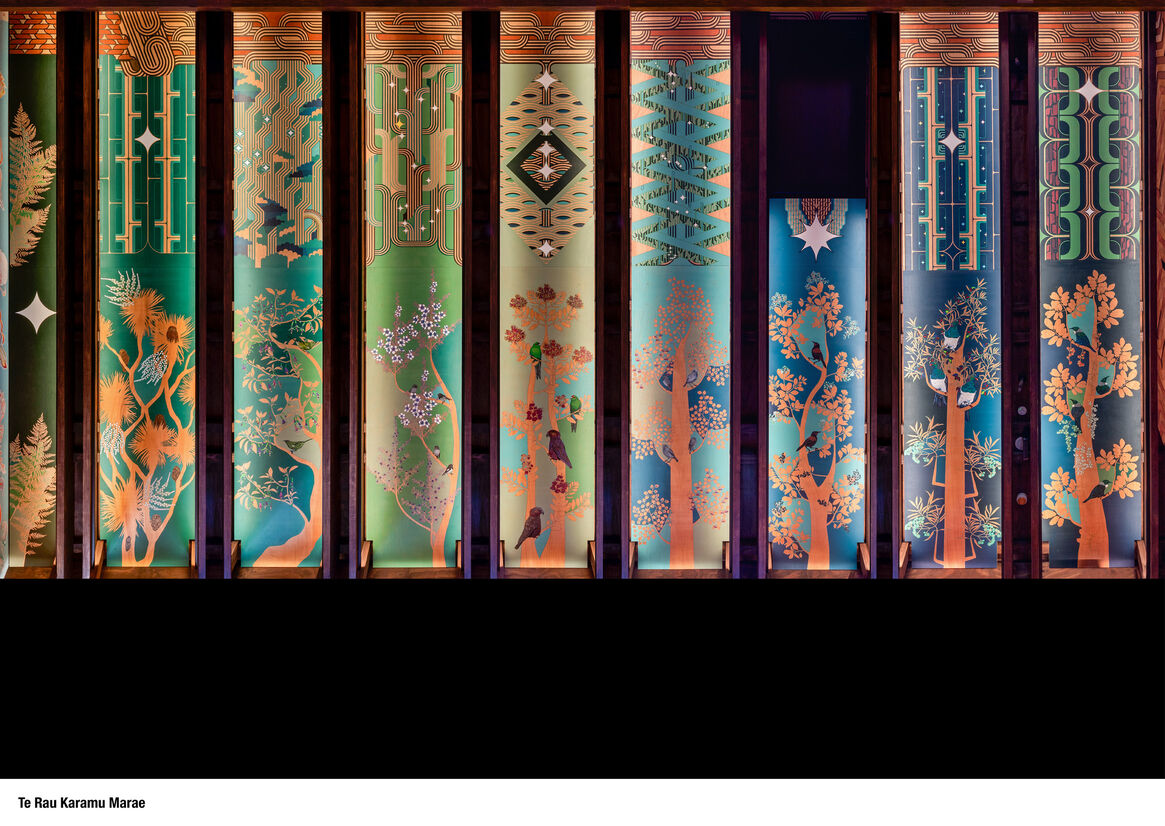 The different aspects of the wharenui’s toi whakairo (artwork) speak to the forest’s relationships to birds, insects, waters, light as fire, sun, moon, stars, the cosmos, light as energy, genealogically linked to wāhine/tāne atua, bring us back to our sense of belonging here in Te Ao Mārama - the world of light.