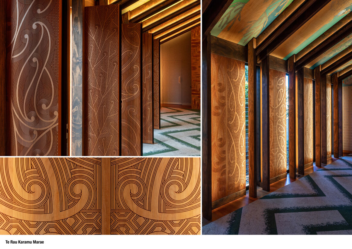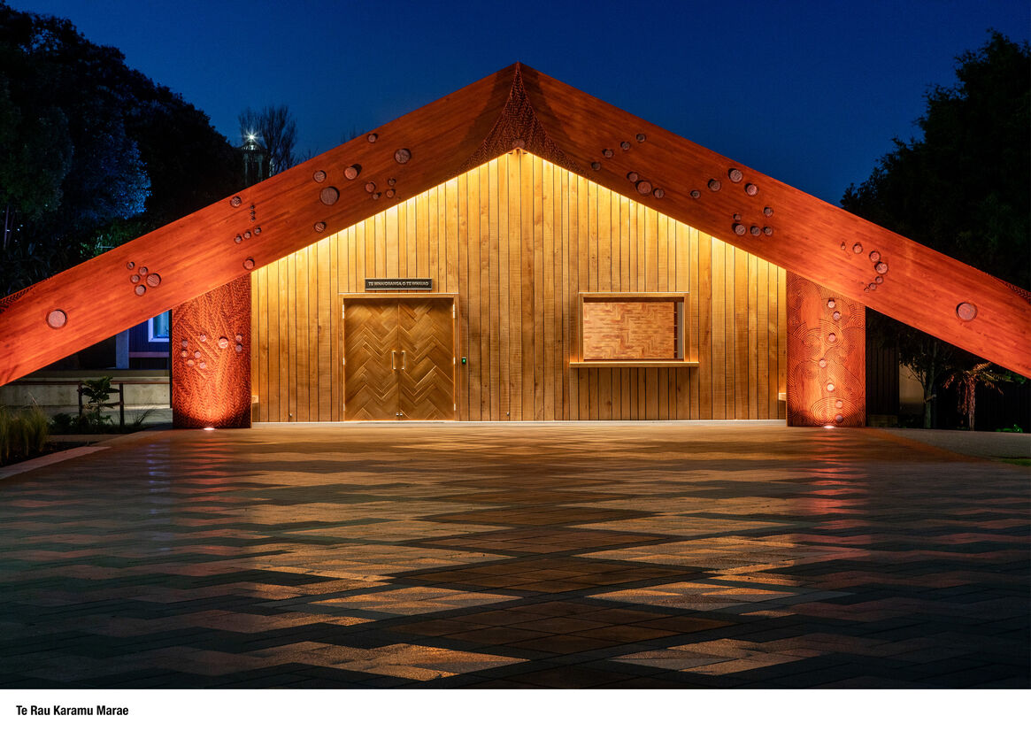 At the marae complex entry, exterior lighting across the totara gateway and wharenui are positioned to highlight and enhance the detailed carving reliefs and ceramic surfaces, enhancing the warmth of the timber, while also reinforcing height and scale. These illuminated structures and spaces are strongly atmospheric, communicating protection, stability and mana.