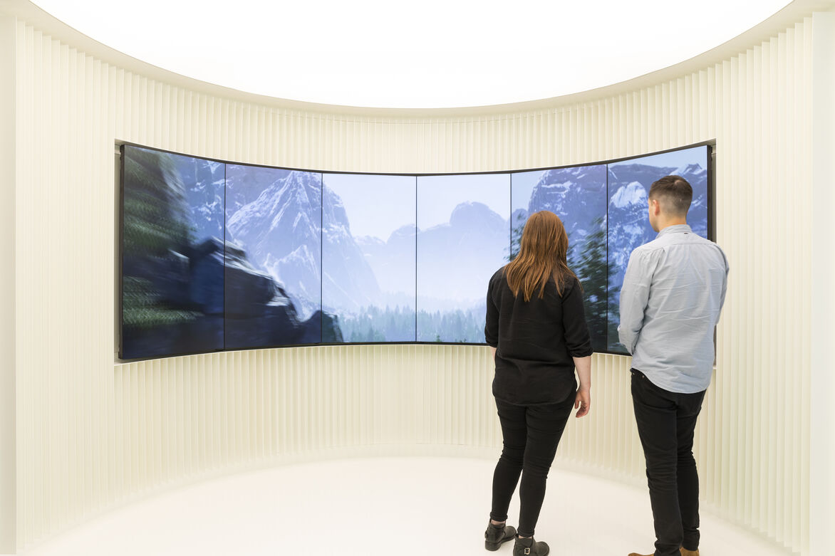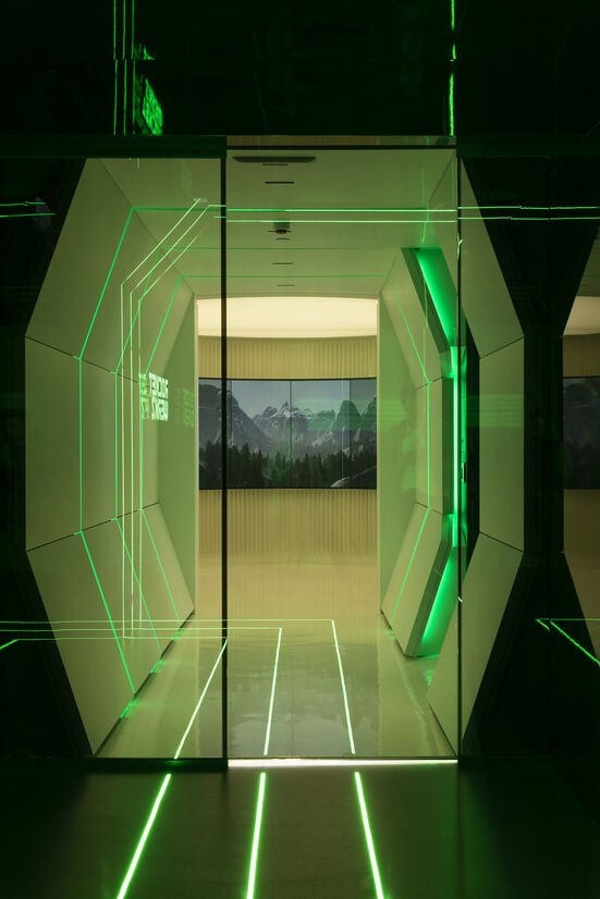 Circular digital immersion rooms clad in aluminium fins all backlit by a Barrisol ceiling. Intentionally snubbing recent trends, natural timbers and finishes were spurned in favour of concrete, glass, steel, aluminium, epoxy, fibreglass and P.E.T.