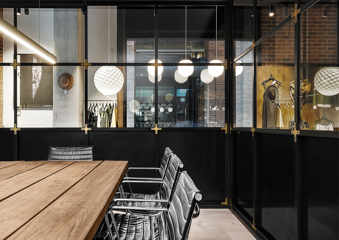 Materiality is rich and indulgent, and played off against the industrial qualities of the building shell, which are left exposed. Soaped white Dinesen floor boards support bespoke oiled steel partitioning. Fumed oak and patinated brass joinery frame the spaces.