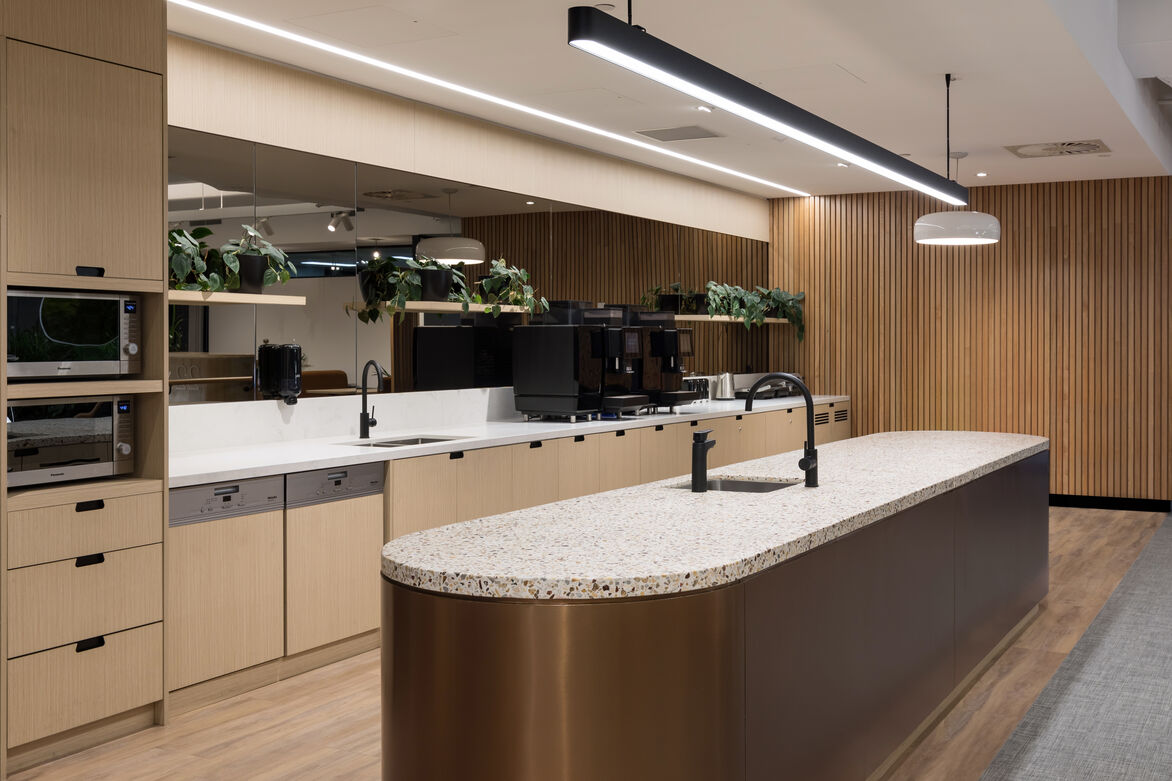 As with the floor below, the breakout hub is designed to maximise natural light and views with the staff area getting the best location of the fitout. Work areas and common spaces also have built zones kept away from the façade wherever possible to maximise light and views.