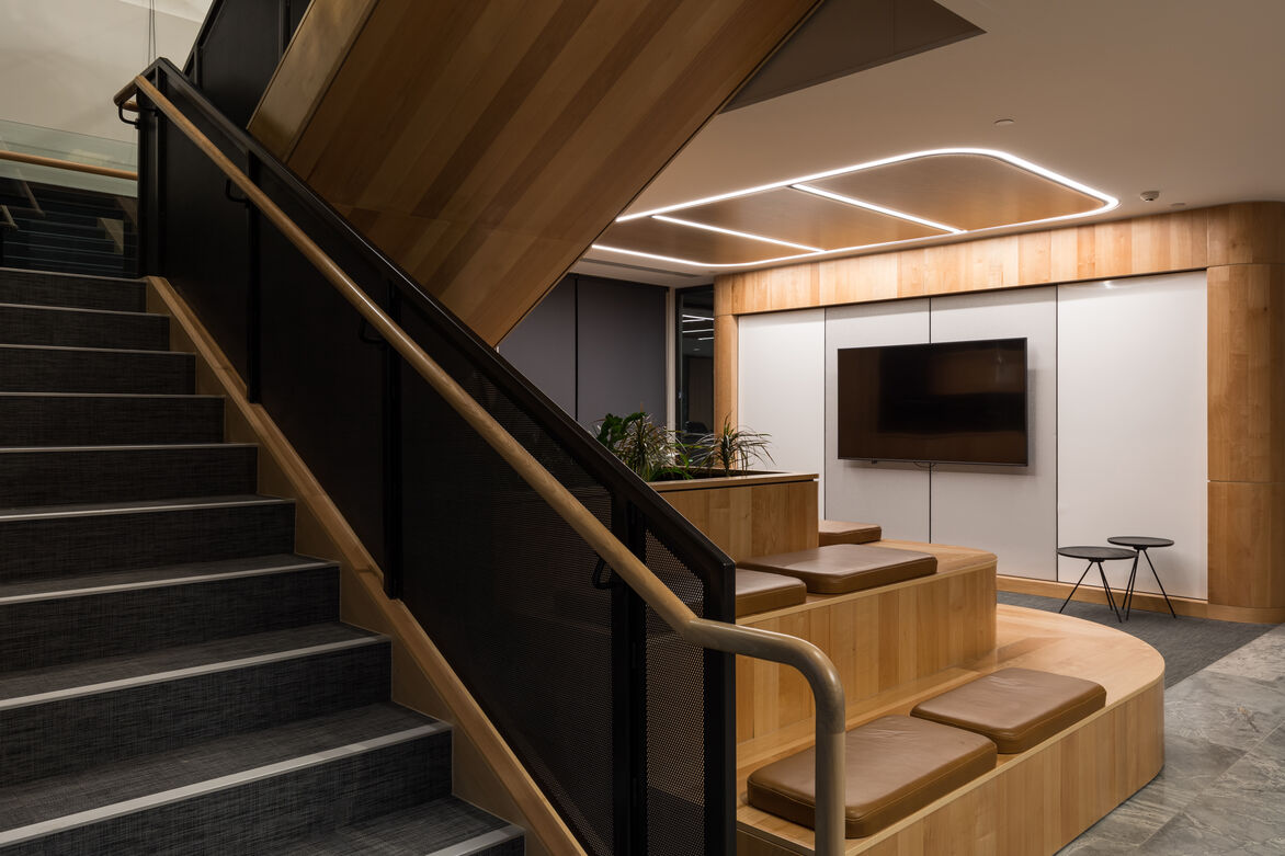 Collaboration spaces are clustered around the stair to activate the connection between floors and encourage bump meetings and cross team pollination.