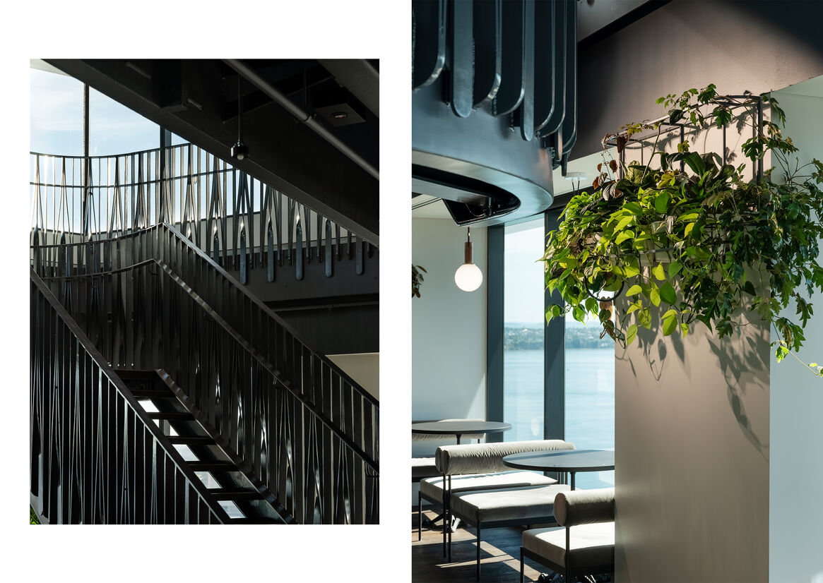 Almost 1/3 of the floor plate is offered to co-working and collaboration amenity. This is enabled by mobile staff and seamless technology. A generous shared hosting and hub space is capable of welcoming small or large auctions and showcase events with dramatic harbour views. Acoustics are controlled across these spaces and along with the placement of the raised floor and planting, allow for visitors and staff to collaborate or entertain at once. The advent of the arrival and welcoming sequence feature as a communal refuge and networking patio, each lift core commanding a contrasting feature wall treatment to chauffeur guests into the space. Blue steel cladding is punched with an array of 3D motifs while the twisted steel of the staircase ignores the limitations of fabrication - adding to the gravity of space.