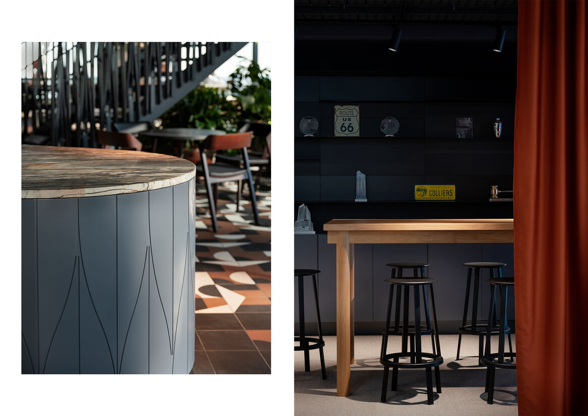The hosting space and shared elevated hub is reflective of an outdoor terrace. Abraded and accented with warm light, it is crafted with heavy texture timbers, dark character tones and a familiar comfort. The reception and meeting suites are presented in contrast by a refined rhythm of warm timber and neutral render and framed by slim etched glass and rolling soft form. The ornate artisan stair ascends between two floors and is a distinction of intricacy connected with the dynamism of the Art Nouveau theme. Jurassic limestone flooring and an abundance of planting stimulates the visual sense and is relived across the workspace with simpler concentrations of rich colour, light, and reflection.