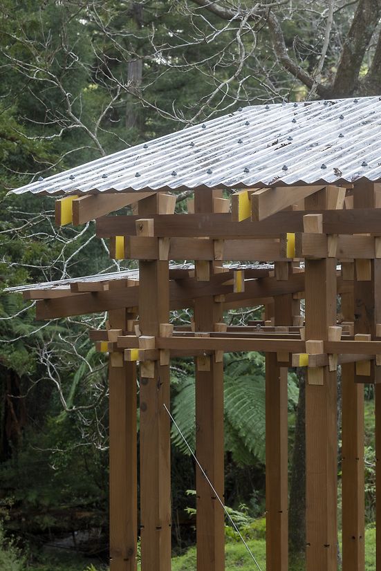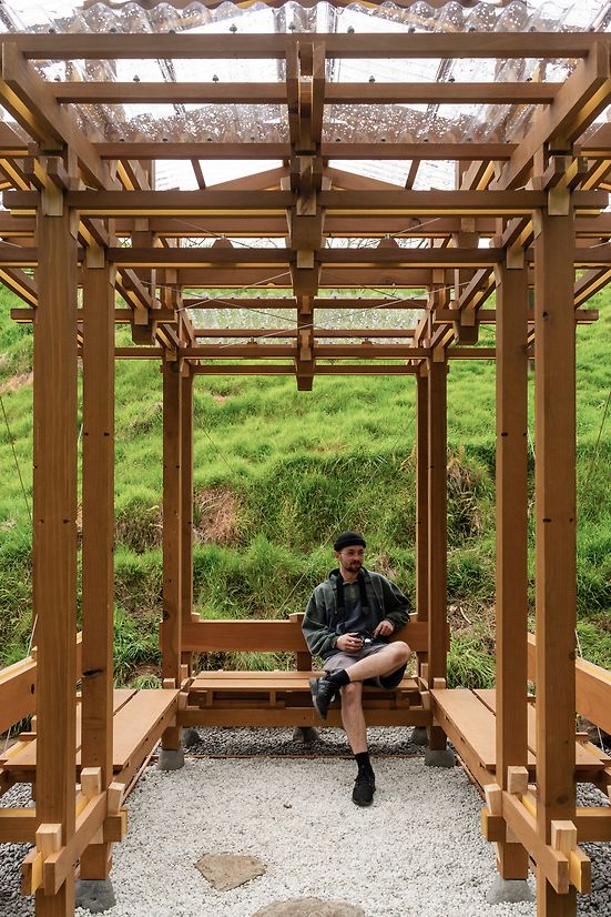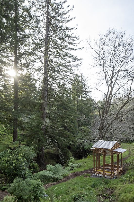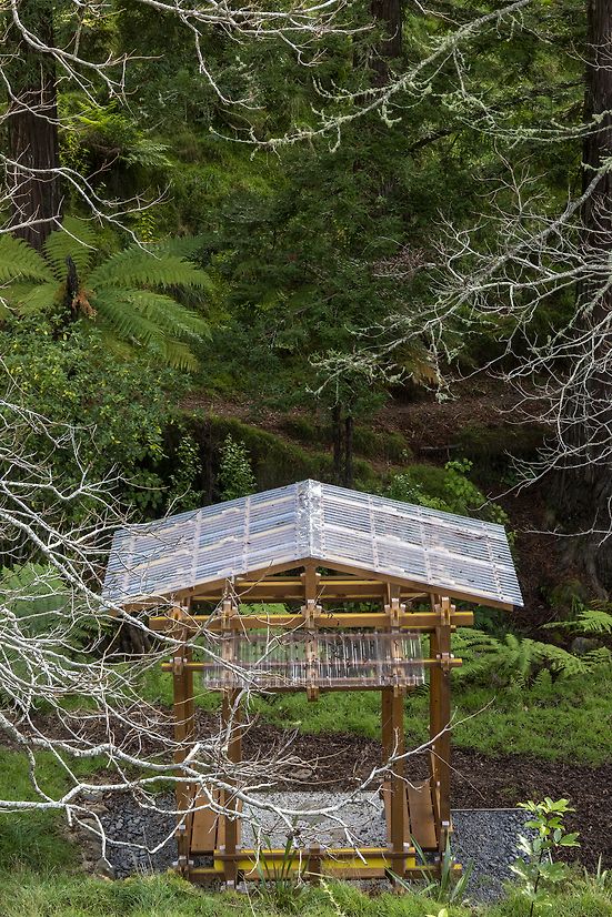 The Wedge Pavilion sits quietly next to a burbling stream in a bush filled valley. Functionally, it is very simple, serving as a resting place for cyclists and hikers on the farm’s network of mountain-bike and walking trails. However, the pavilion is really a suggestive space—seeking to question and advance the way we build.
