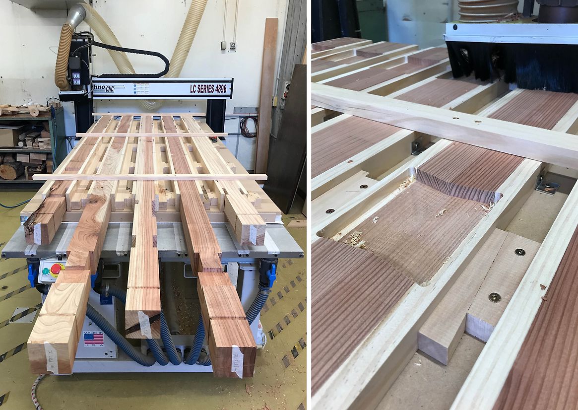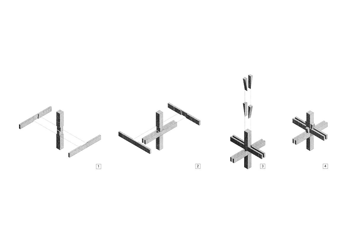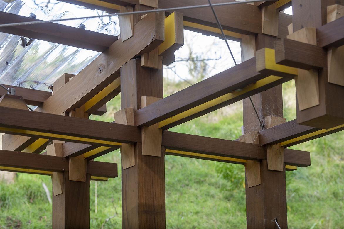 The use of a system of wedged joints allowed the structure to be assembled without requiring the timber to be especially stable or a high degree of accuracy in fabrication. The wedges ensure that each joint can be fixed together tightly to produce a strong joint, and can be adjusted and re-tightened as the timber continues to shift and settle over time. By using CNC milling for the fabrication of the structure, hundreds of complex parts, which otherwise would have been extremely arduous to produce, could be produced quickly without error.