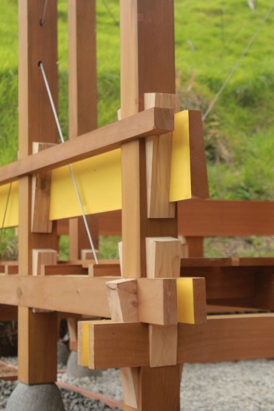 The frame is a combination of redwood posts and beams, with harder cypress wedges. All the timber was grown on the farm where the building was constructed. As such, the embodied carbon of the pavilion is negative. The project was easily assembled, requiring little more than a mallet and a wrench, and without the need for a skilled builder or heavy equipment. What’s more, the elimination of permanent fixings also means that the pavilion can be easily deconstructed for relocation or recycling.