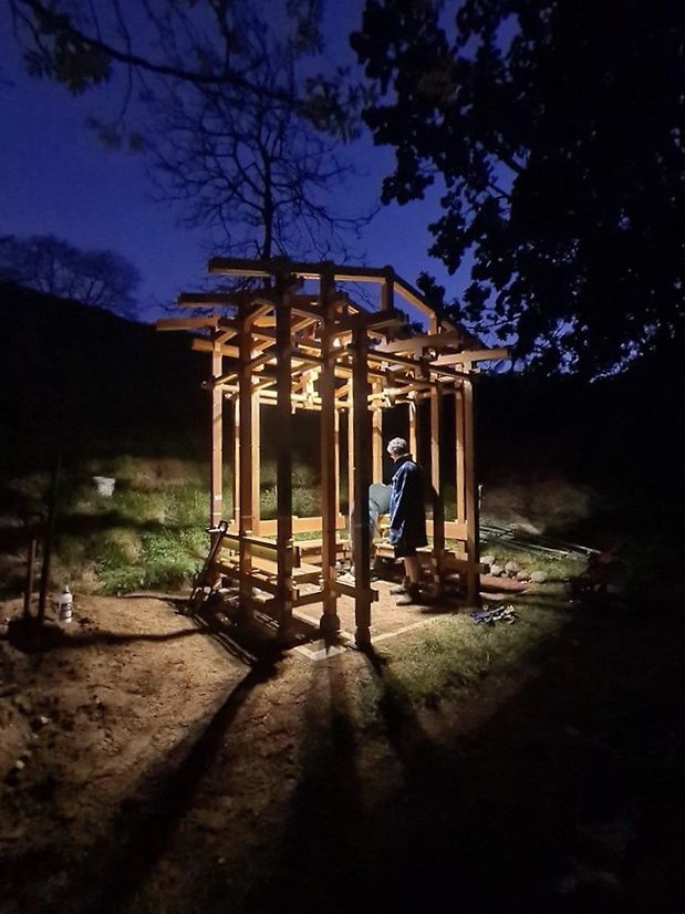 Built without the use of nails or screws (excluding the roof fixings), each post, beam, joist, and rafter connection was made using fully timber-to-timber wedged joints. This allowed it to be fully prefabricated, with a 100% test assembly carried out in the workshops. With the structure being located a 20-minute walk from the nearest road, it was also engineered to eliminate the need for concrete in the foundations.