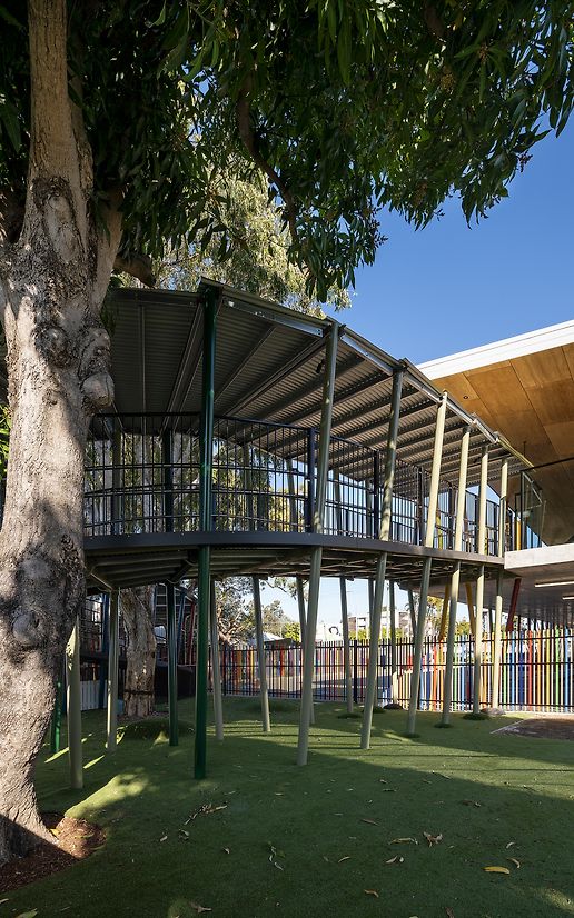 One of the standout features of the new centre is a ramp that winds around established trees, allowing children to explore treetops in shaded comfort. This element exemplifies our integration of biophilic design, fostering a deep connection with nature.