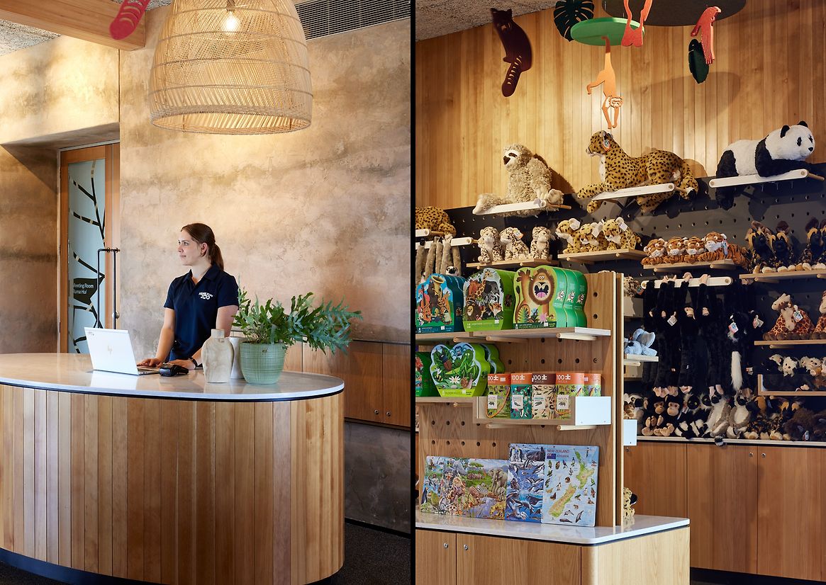 The Kaakaa narrative is referenced in a singular roof canopy that spans across the road, like outstretched wings acting as the gateway to the precinct. The architecture flows as an extension of the kaakaa wing canopy to become a multi-purpose arrival building incorporating hospitality, retail, visitor kiosk and precinct offices and amenities. The red and brown tones in the timber of the canopy mimic the Kaakaa's prized under-feathers, and act as the thread from outside to inside. Landscaping elegantly integrates vehicle parking, while educational nature paths and a viewing tower offer deeper opportunities for visitors to engage and interpret their context. The interiors feature natural materiality wherever possible with a central wall rendered in a rammed earth effect, flooring in homogenous recycled rubber, and locally sourced and recycled woodtex panels in the ceiling. Hospitality zones incorporate local Hinuera stone and a strong focus on biophilic design throughout. The retail and information spaces showcase a range of enticing wares in bespoke cabinetry with playful zoo animals hovering overhead.