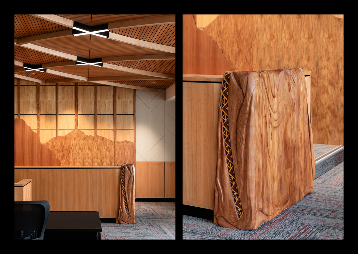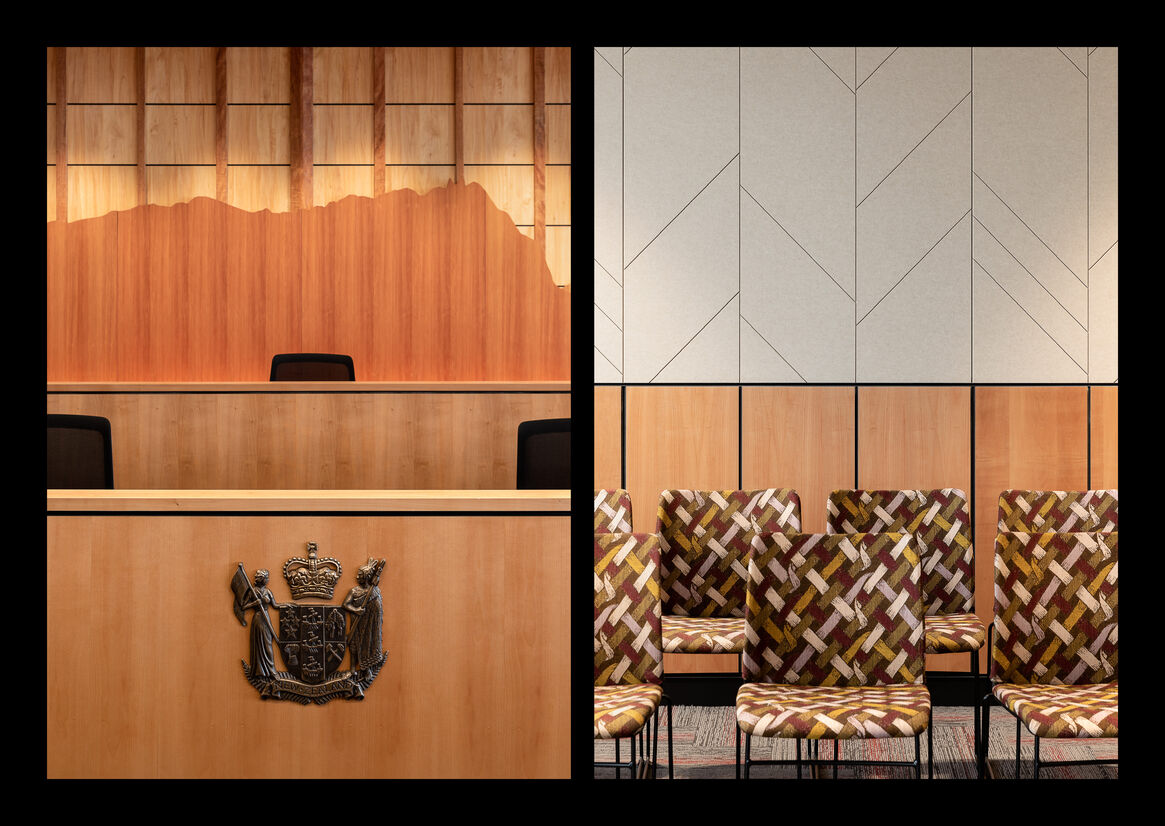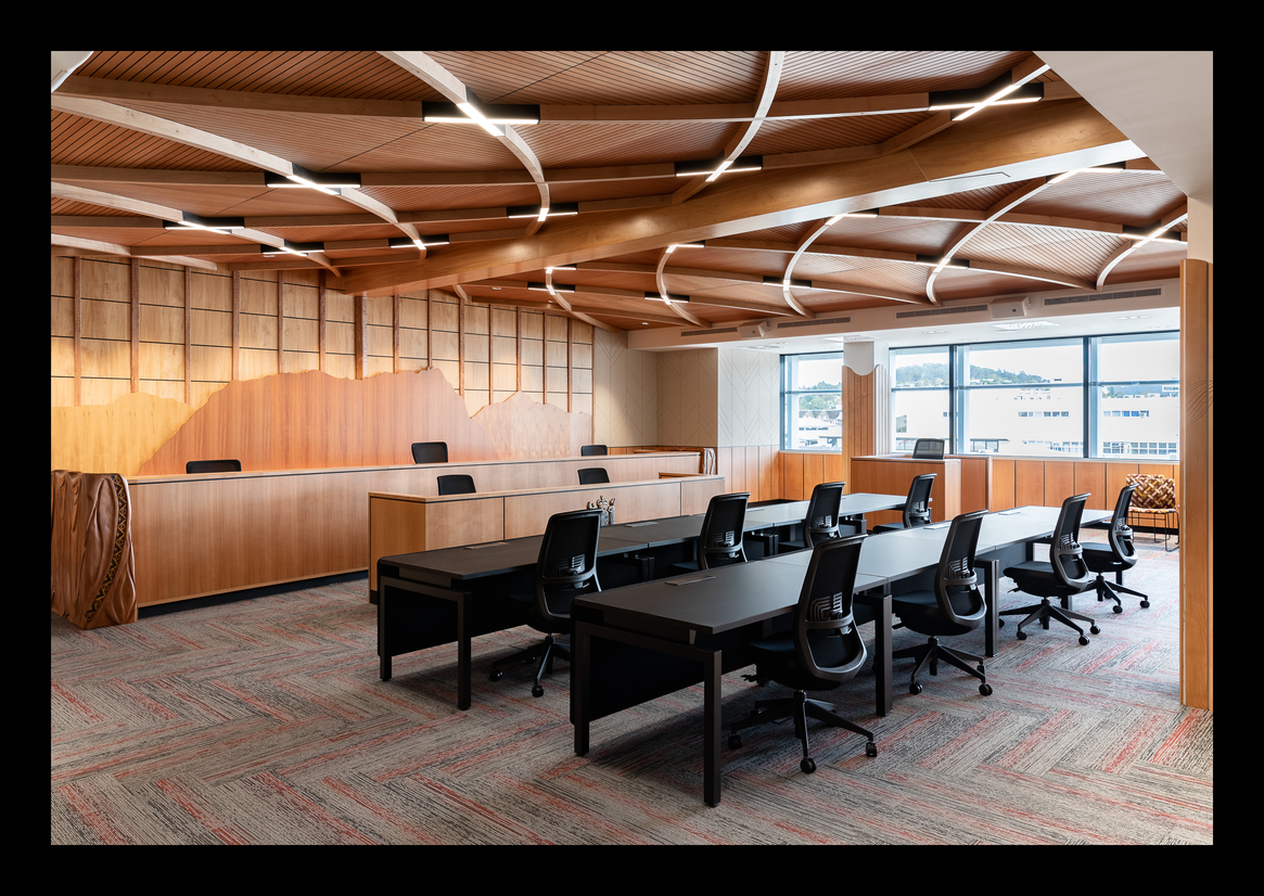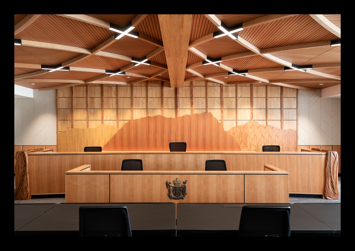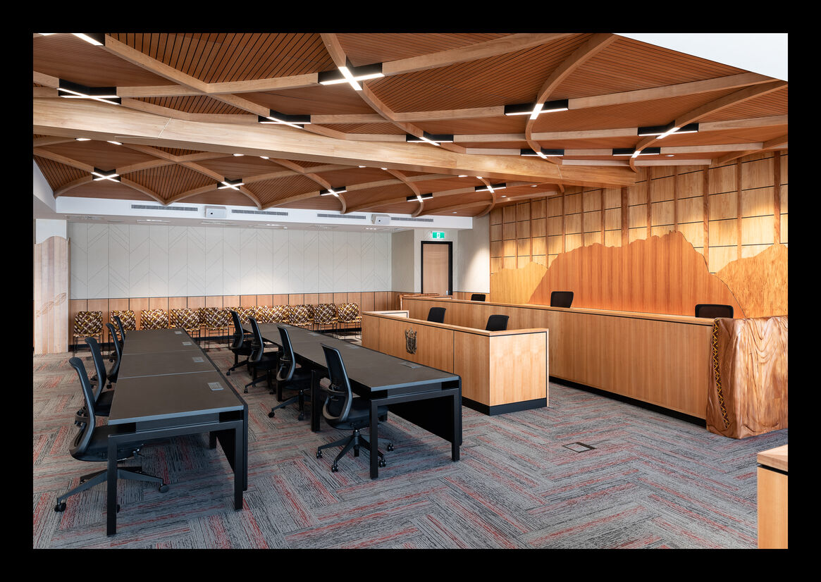 One particularly important feature that ensured a consistent experience in every area was the treatment of ceilings. Within the hearing rooms, a wooden tahuhu provided a central spine that spanned the length of the room and referenced similar structures that characterise traditional Māori construction elements.